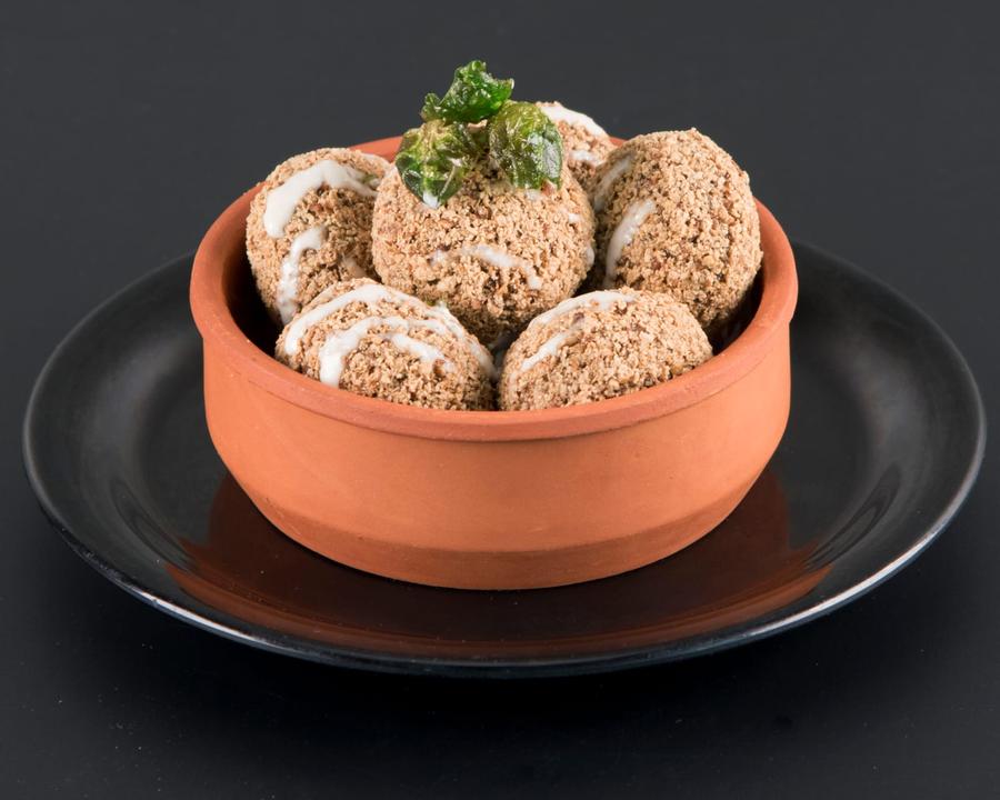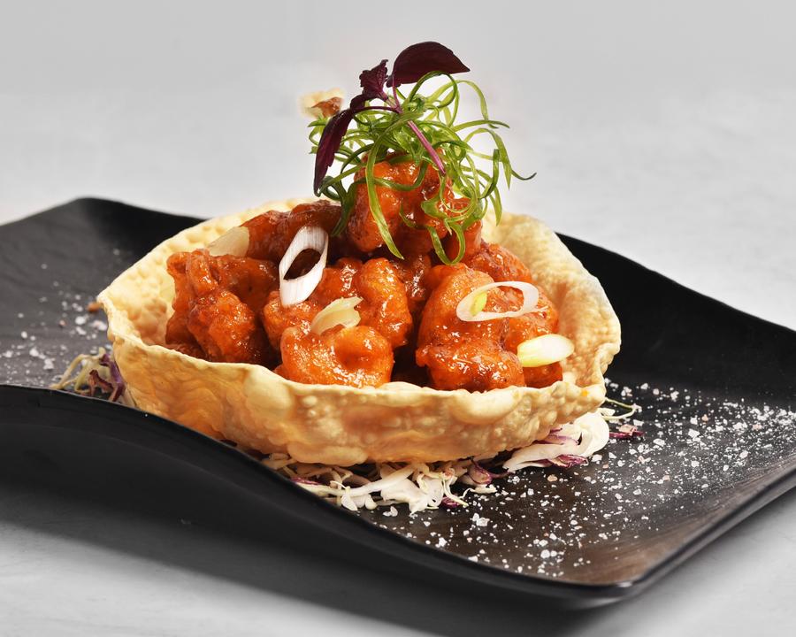 Marinated and fried Chicken leg cubes Marinated dipped with tempura batter tossed with Asian mild sauce sprinkled with chipotli sauce served on papadam basket.