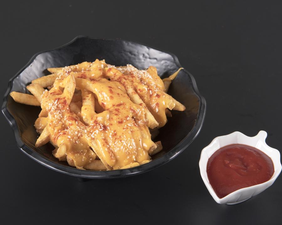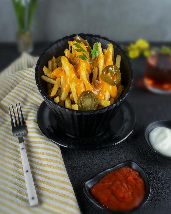 French fries with yellow cheddar cheese,on the top jalapeno and roasted panku bread crump
