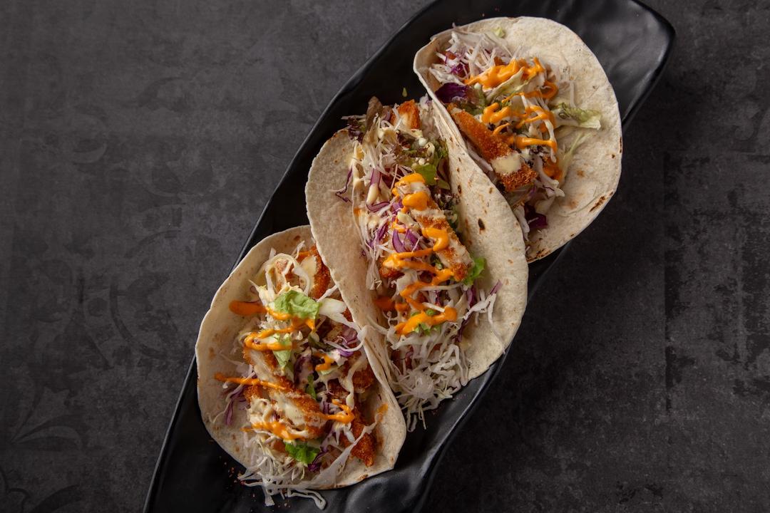 جمبري مقلي ذهبي مقرمش، جبنة مبشورة، خس مبشور، ملفوف و خيار ملفوف في خبز تورتيلا مع صوص وردي خفيف
