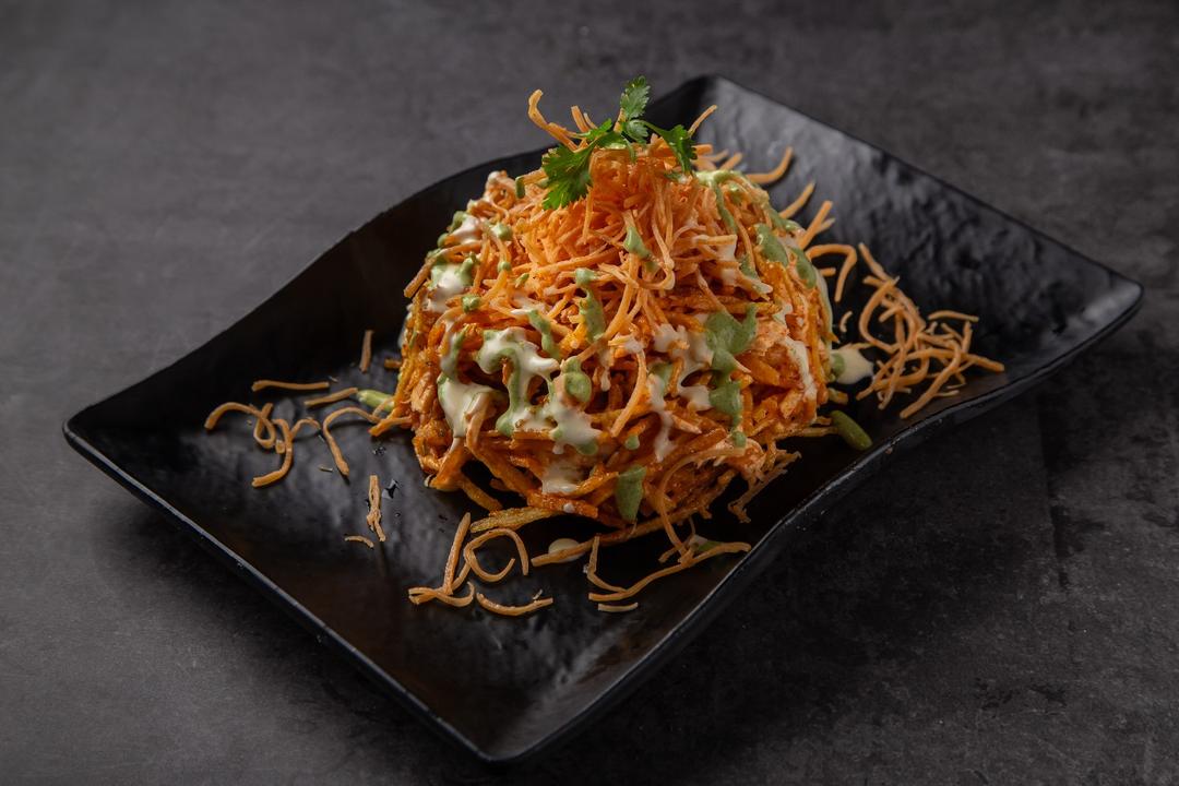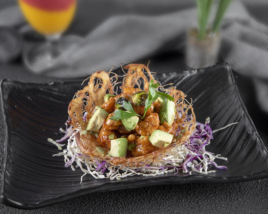 golden butter fried shrimps torched with Volvo sauce, sprinkled cilantro and chipotle sauce, cubes of avacado served Tortilla basket or crispy rice noodles basket.