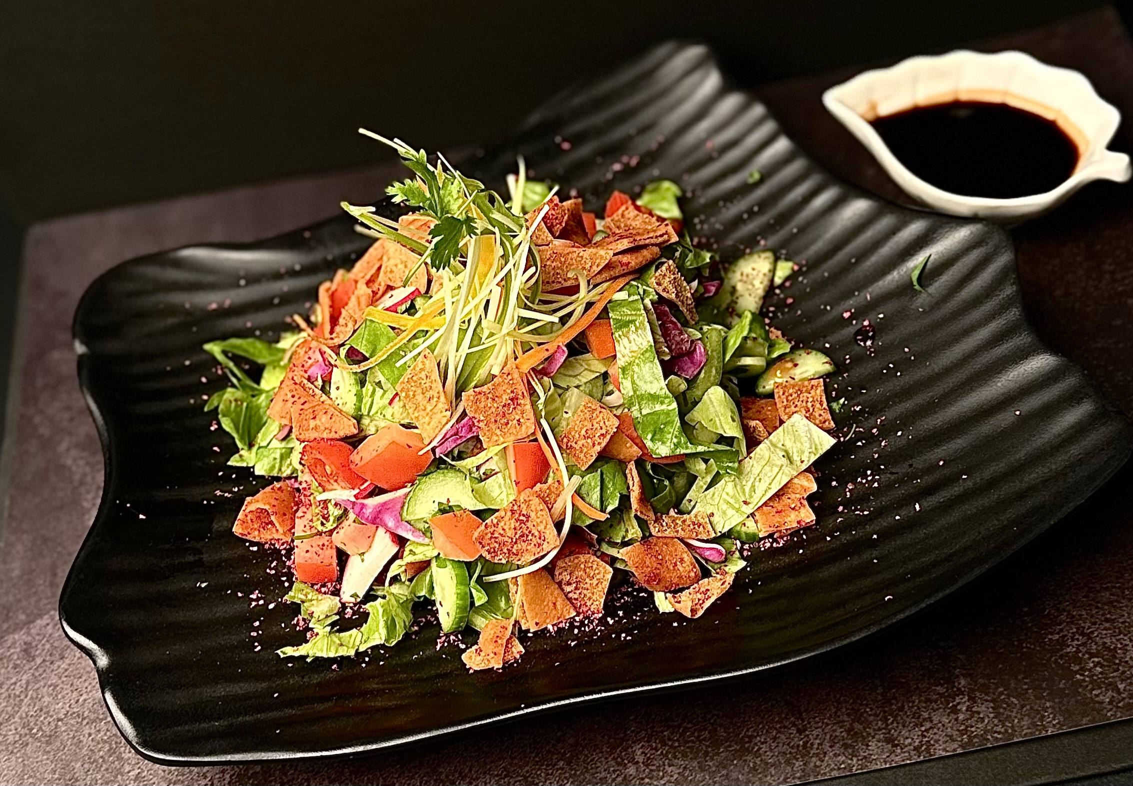 diced beetroot,torched with special pomegranate sauce,served with baby mixed green,goat cheese and crispy beetroot