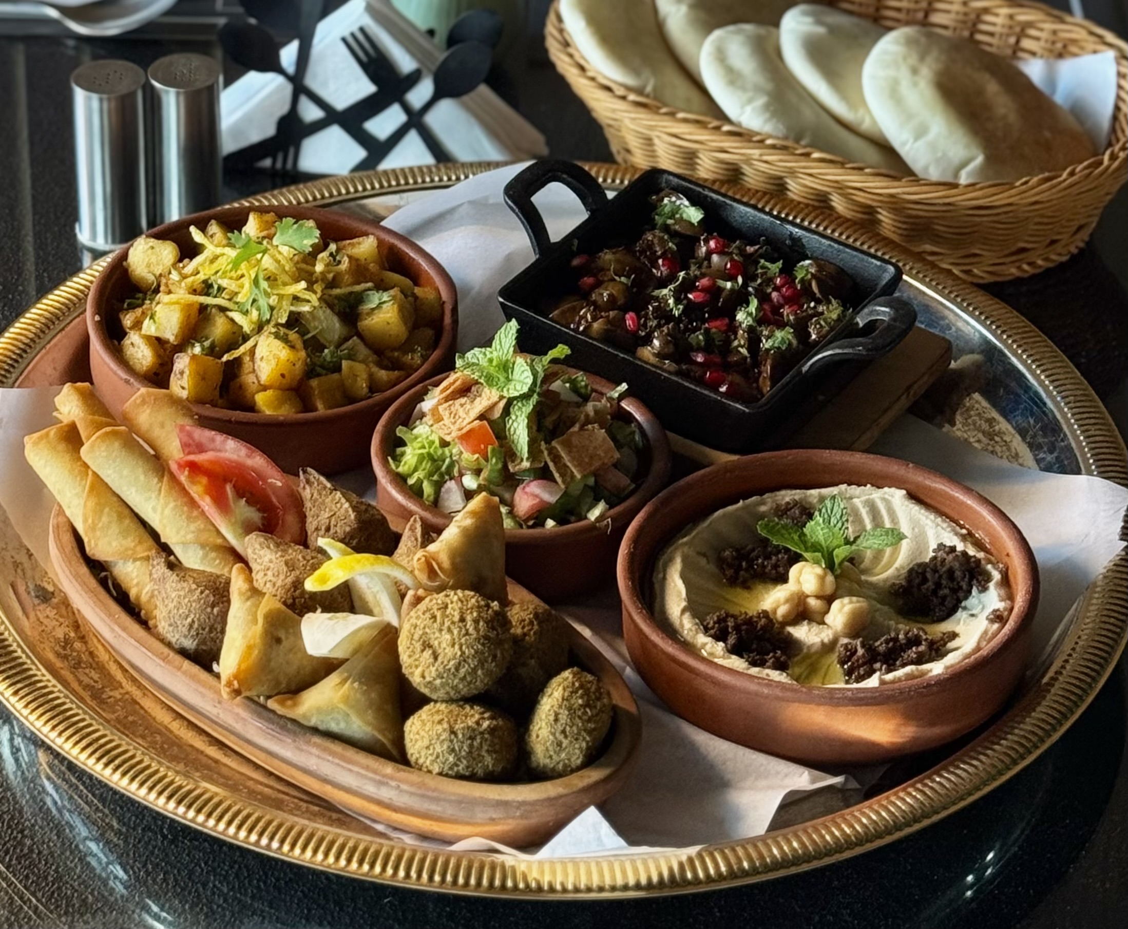 Hamous, Lebneh, Foul, Filafil, White Fetta Cheese, Green Salad, Olives Pickles and Tea served with Freshly Baked Lebanese Bread.