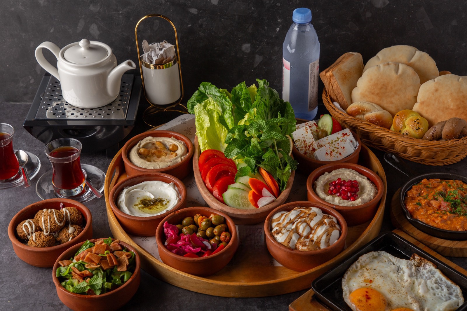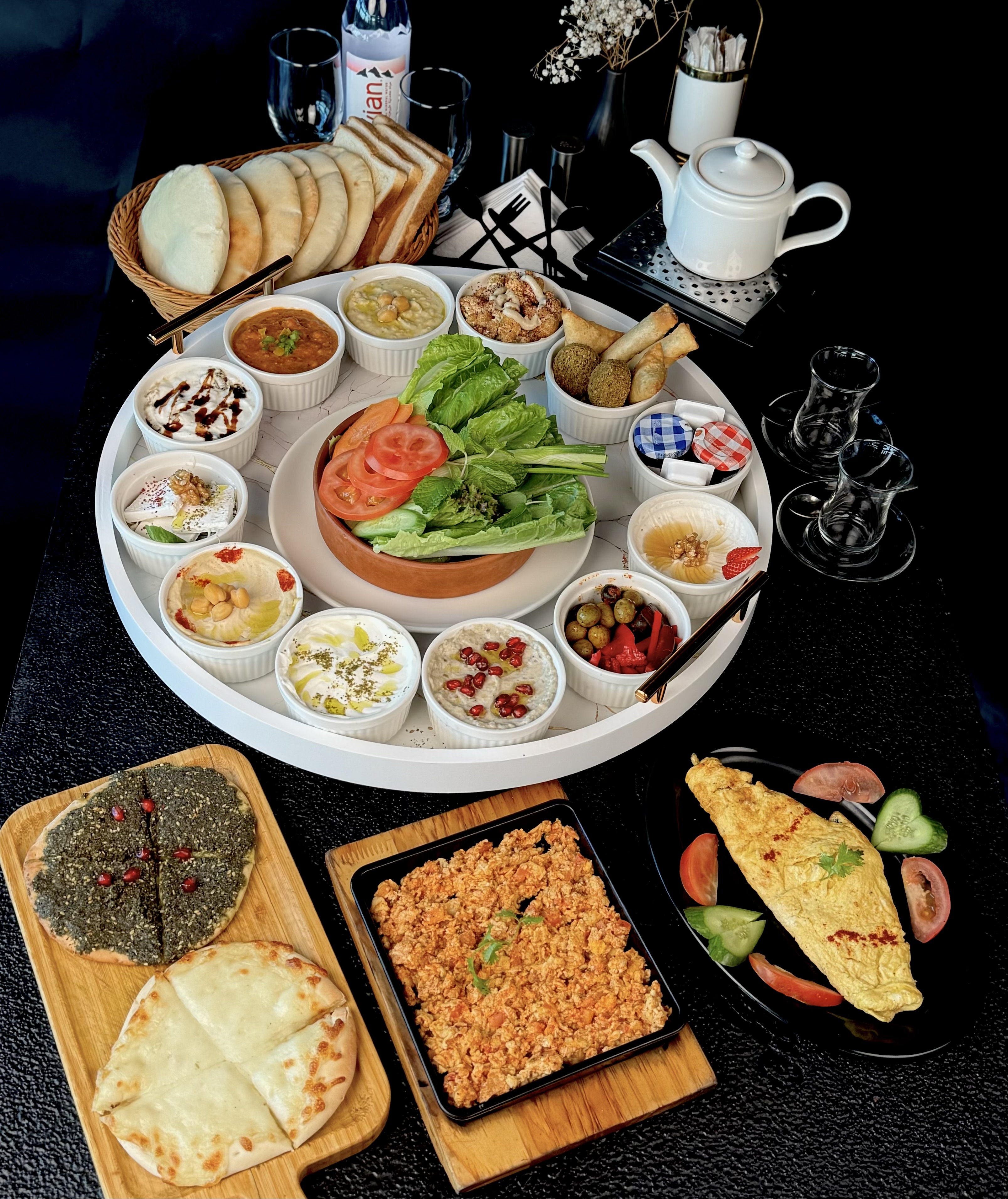 Hammous, Fatteh Eggplant, Mutabbal, Fattush, Lebneh, Filafil, Foul, White Cheese, Egg of choice, Olives and Pickles served with Freshly baked Lebanese Bread, Bread Rolls, Tea and Water.