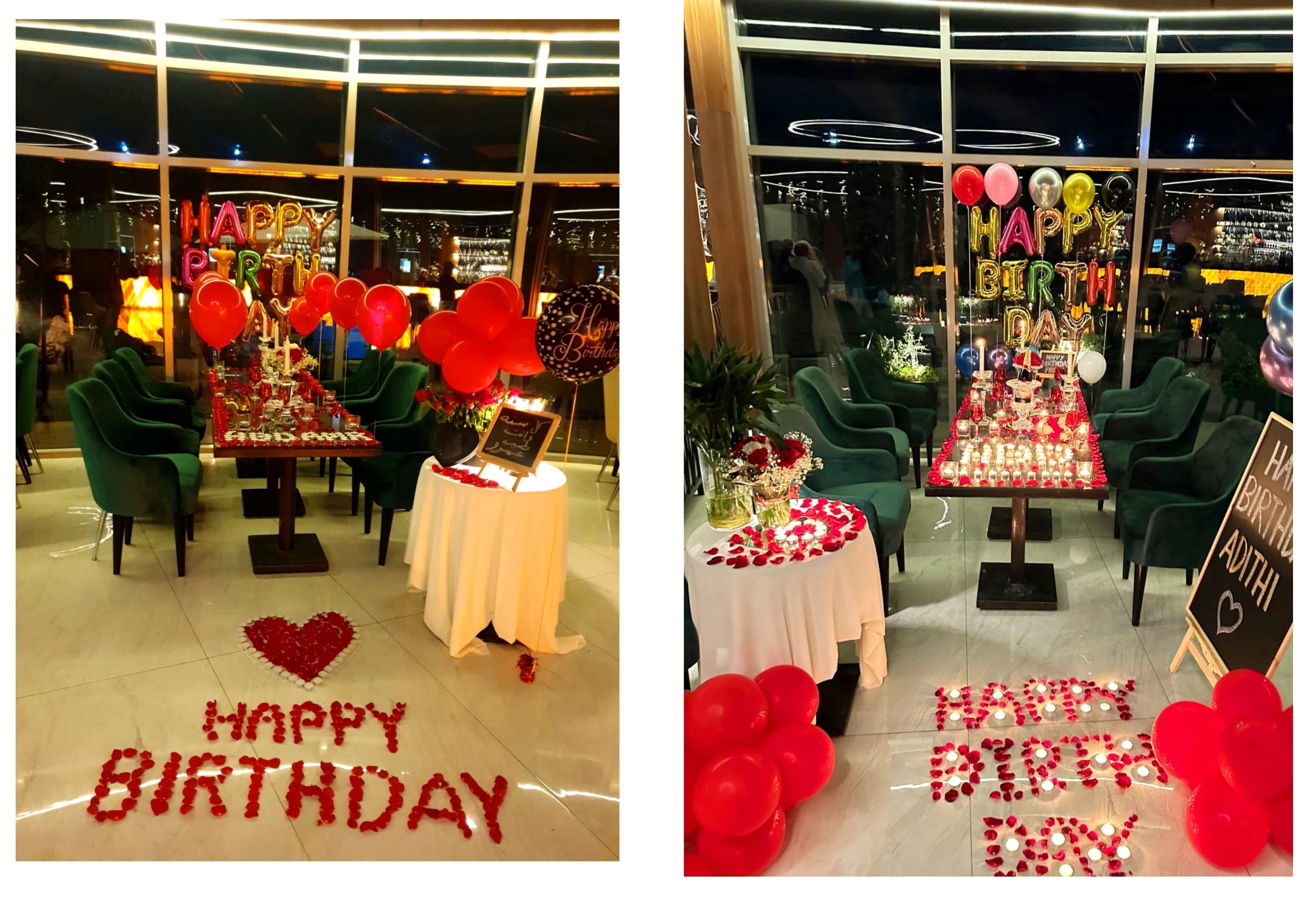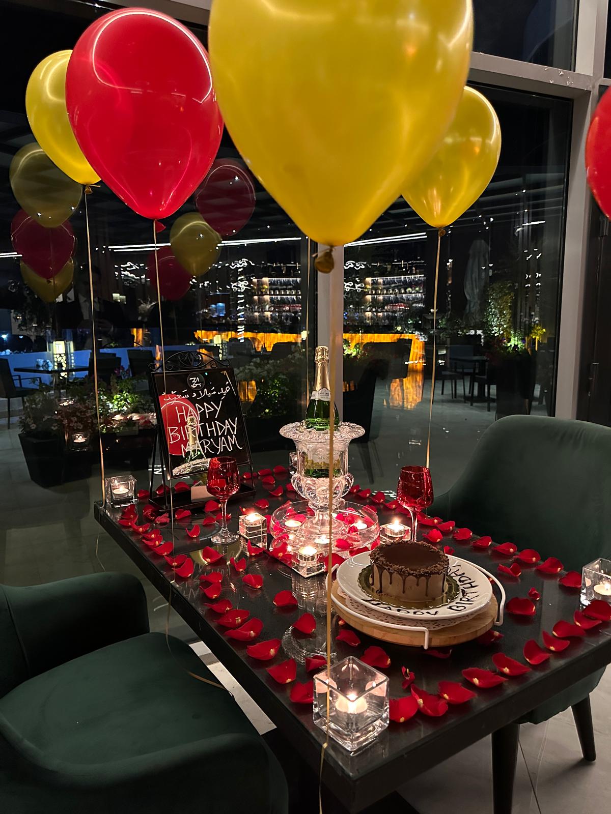 A specially decorated premium Birthday table ( for 4-6 persons) with fresh flower petals, candles and aloons. Served with lovely Chocolate cake Red velvet cake, Sparkling Grape juice and traditional Arabic coffee.