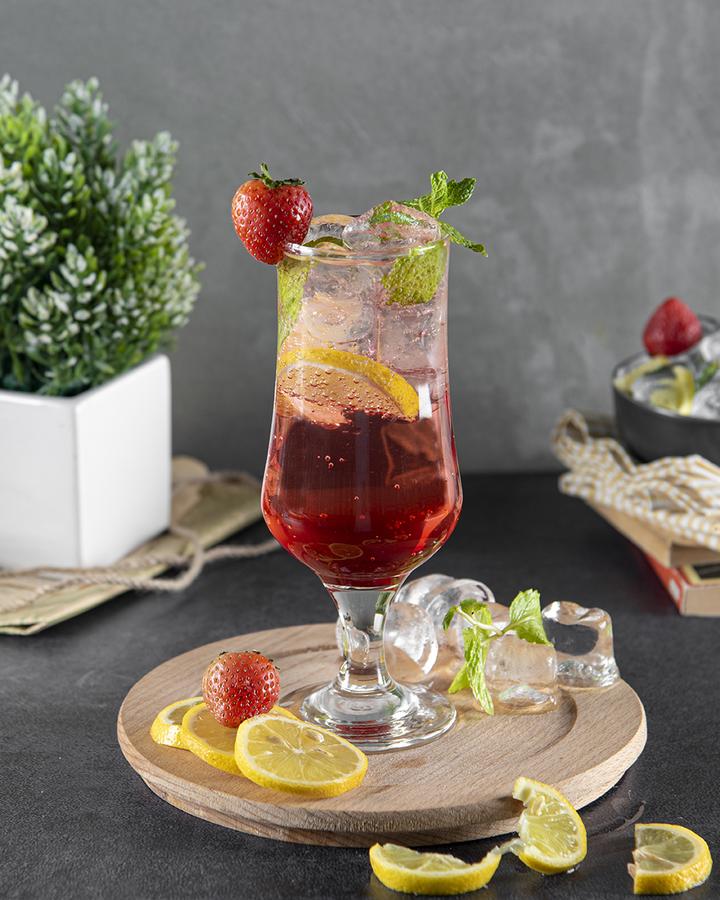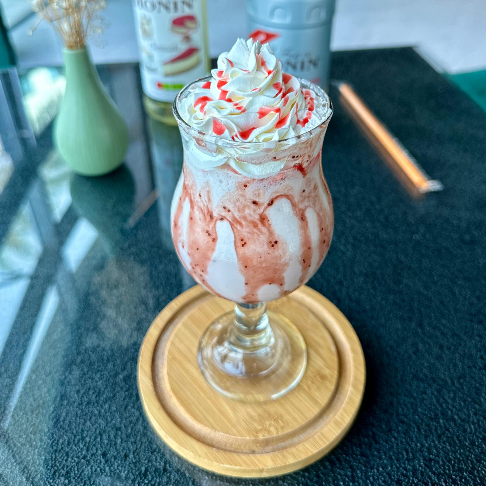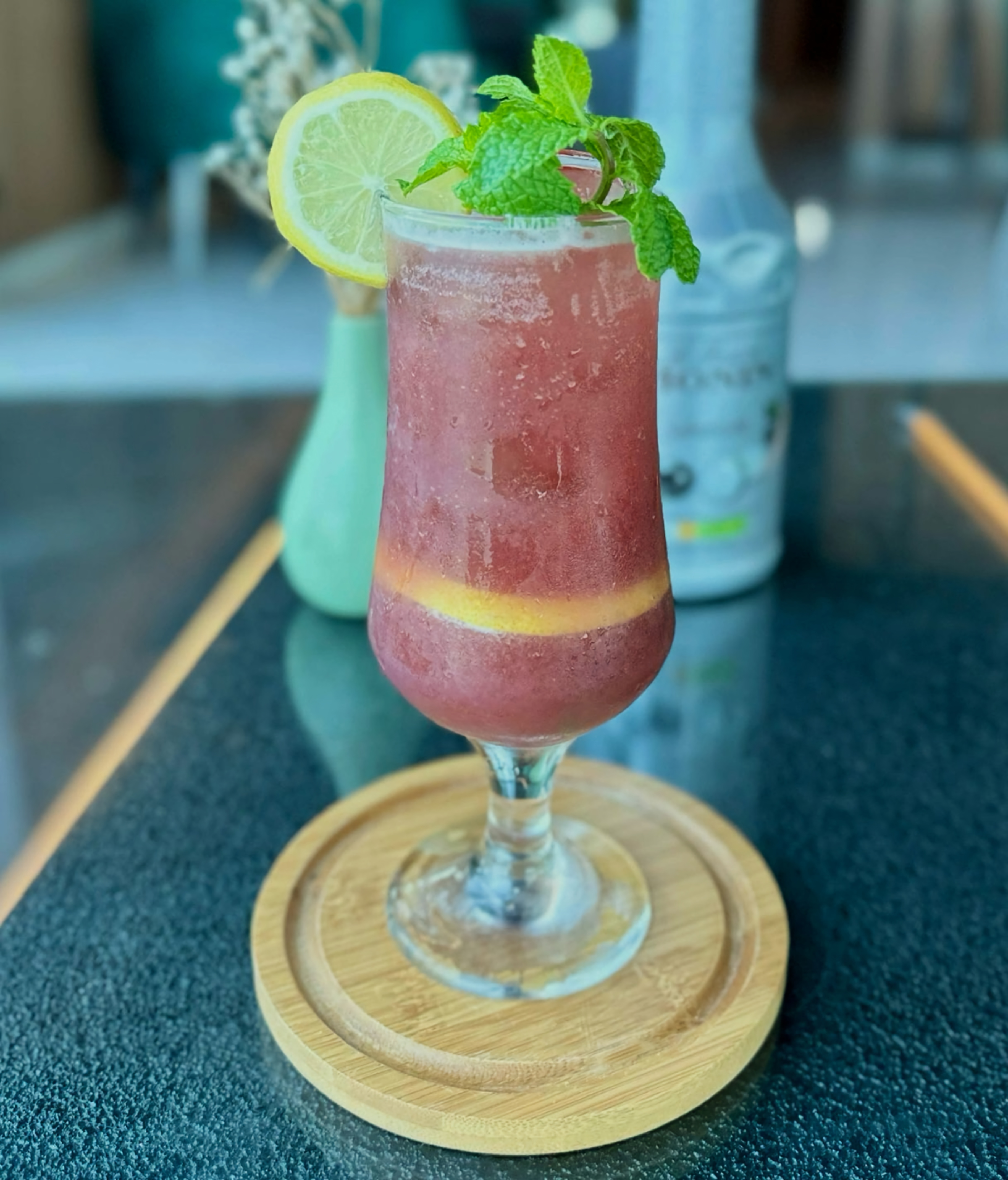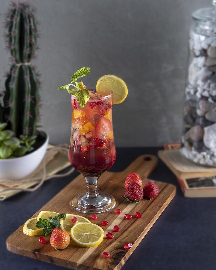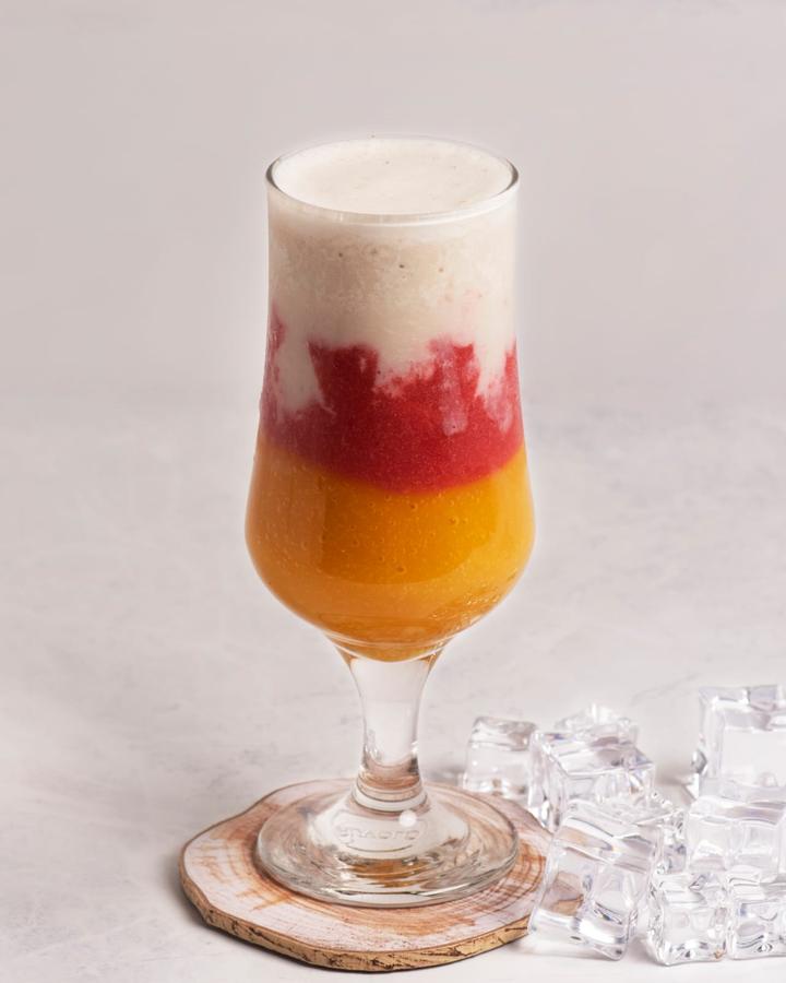 مزيج من عصير البرتقال والمانجو والفراولة وشراب الغرنادين مغطى بالفواكه المقطعة الصغيرة والآيس كريم.