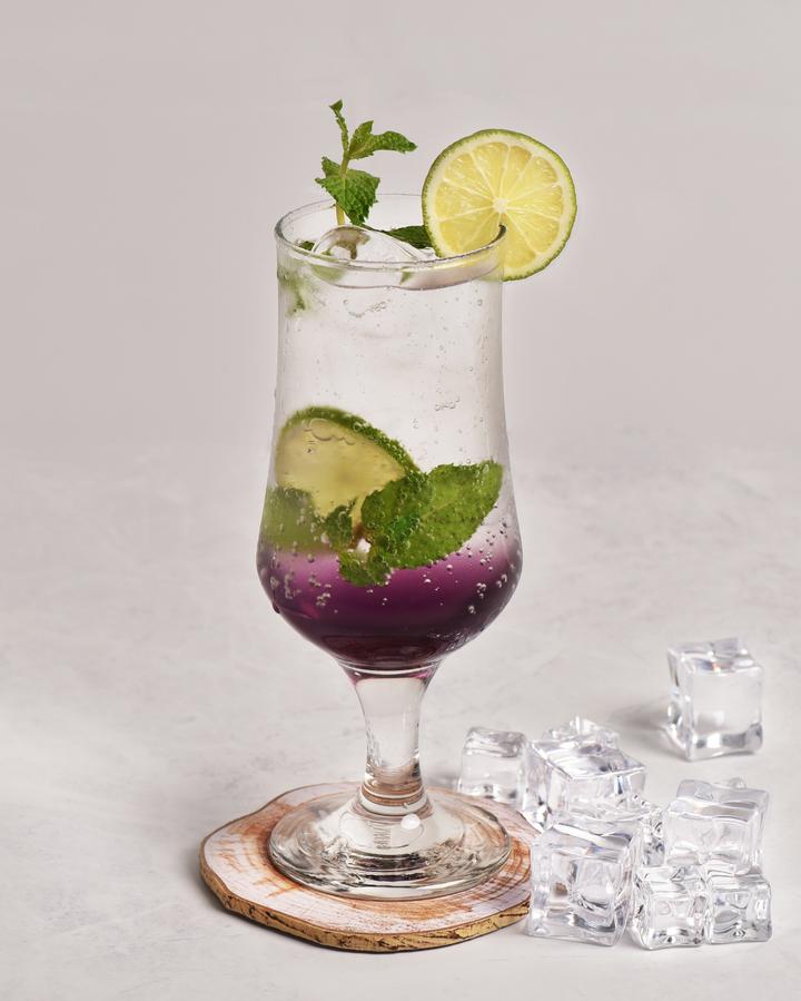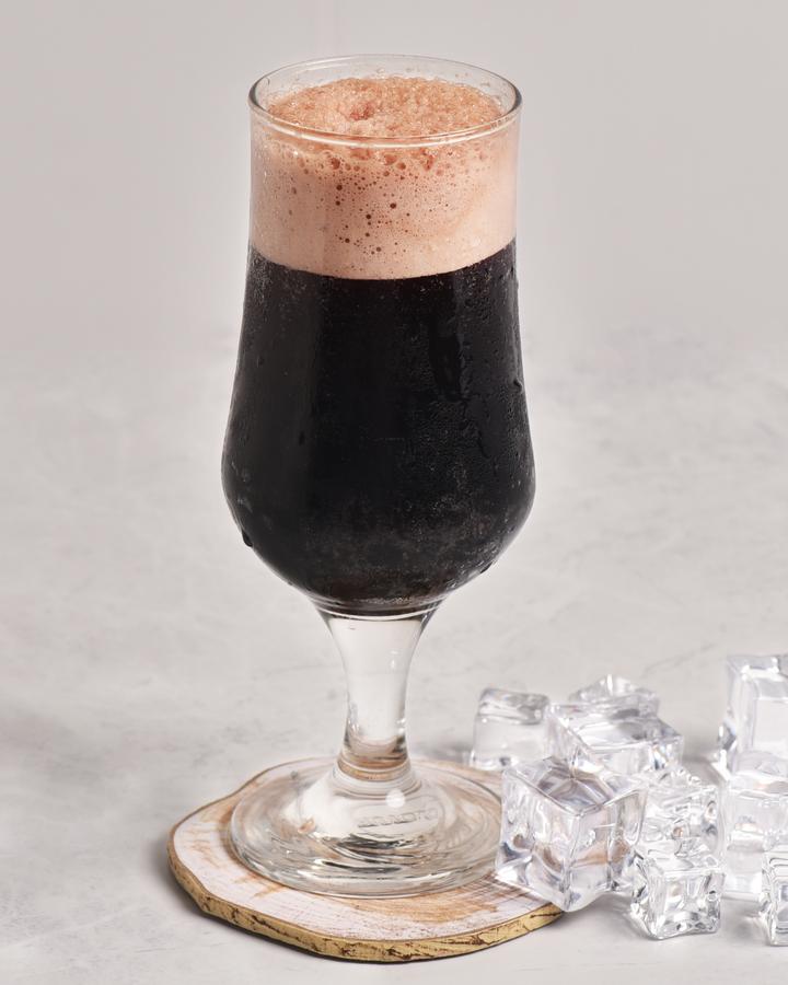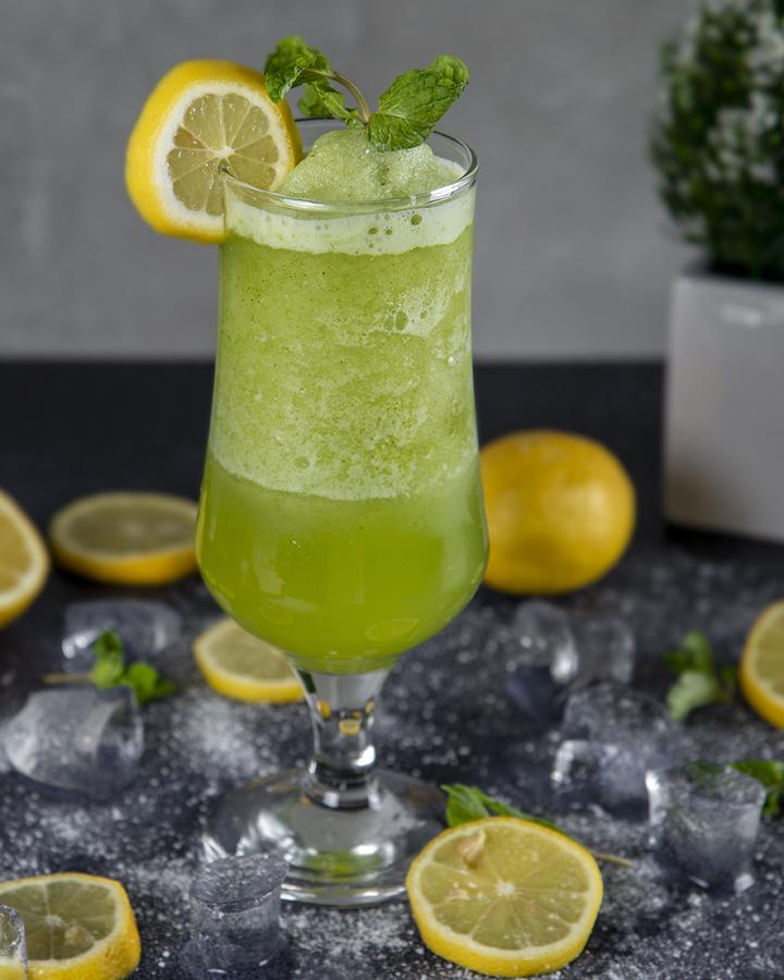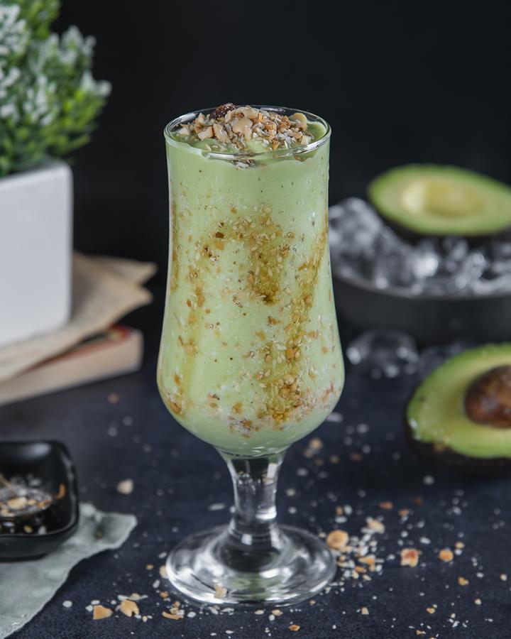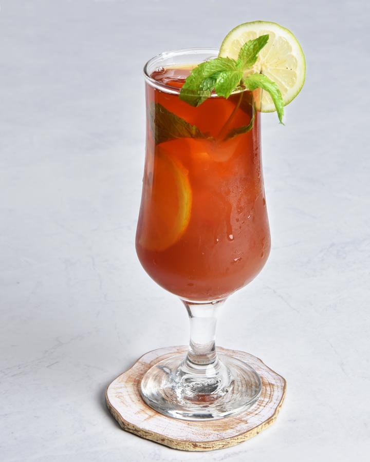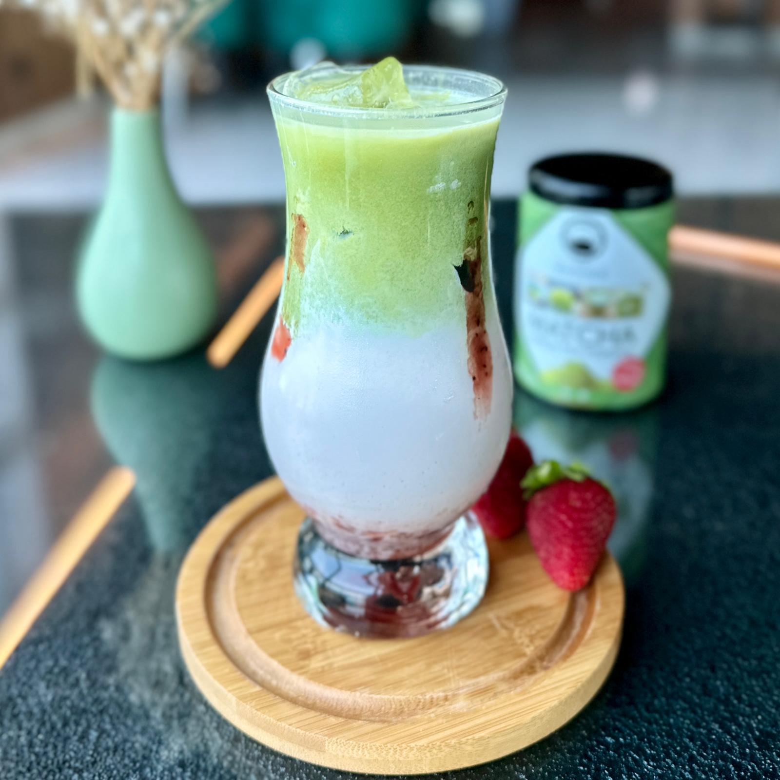 مزيج من عصير البرتقال والمانجو والفراولة وشراب الغرنادين مغطى بالفواكه المقطعة الصغيرة والآيس كريم.