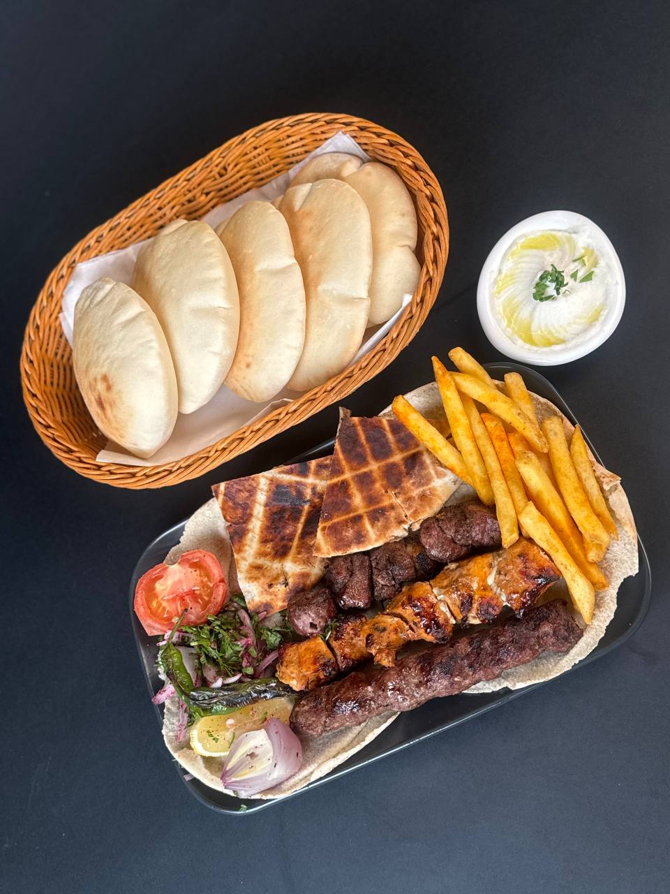1 Each Skewers of Kofta, Shish Tawook, Tikka and half arayis meat served with French fries, garlic sauce and homemade Lebanese bread .