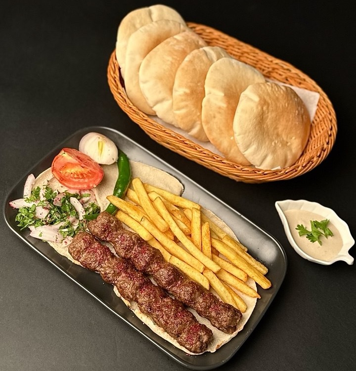 Charcoal grilled 2 skewers of fresh minced lamb marinated with a blend of herbs and spices, served with French fries, tahini sauce and homemade Lebanese bread.