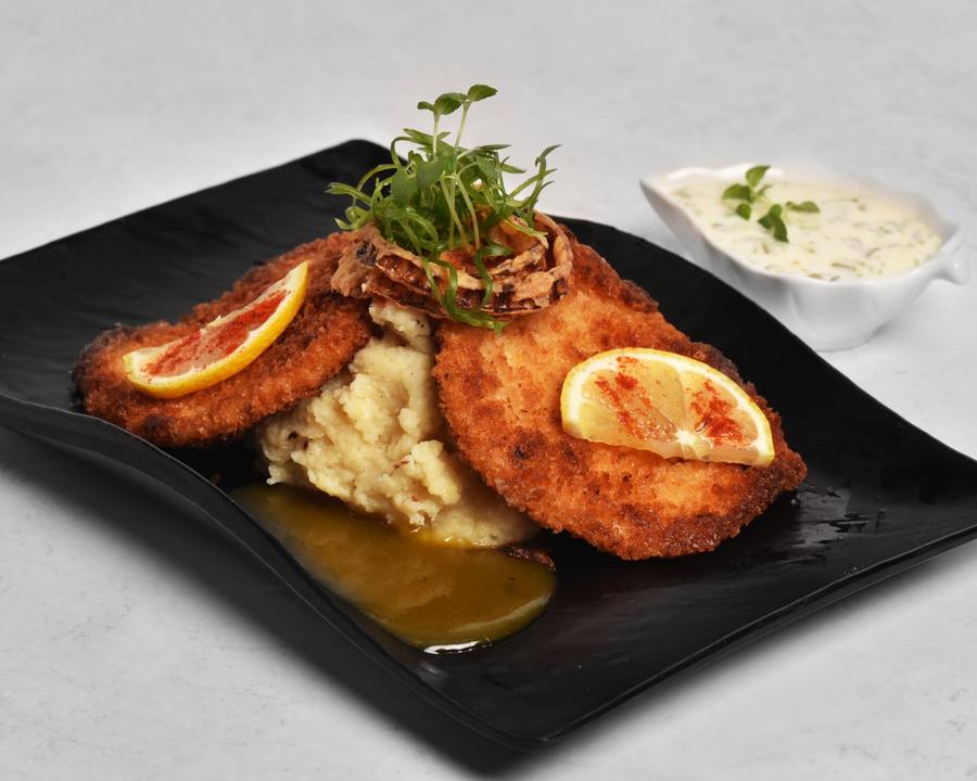 Deep fried Golden Chicken served with Mashed Potatoes and Chitrose Sauce, topped with spring onions and maicro bean.