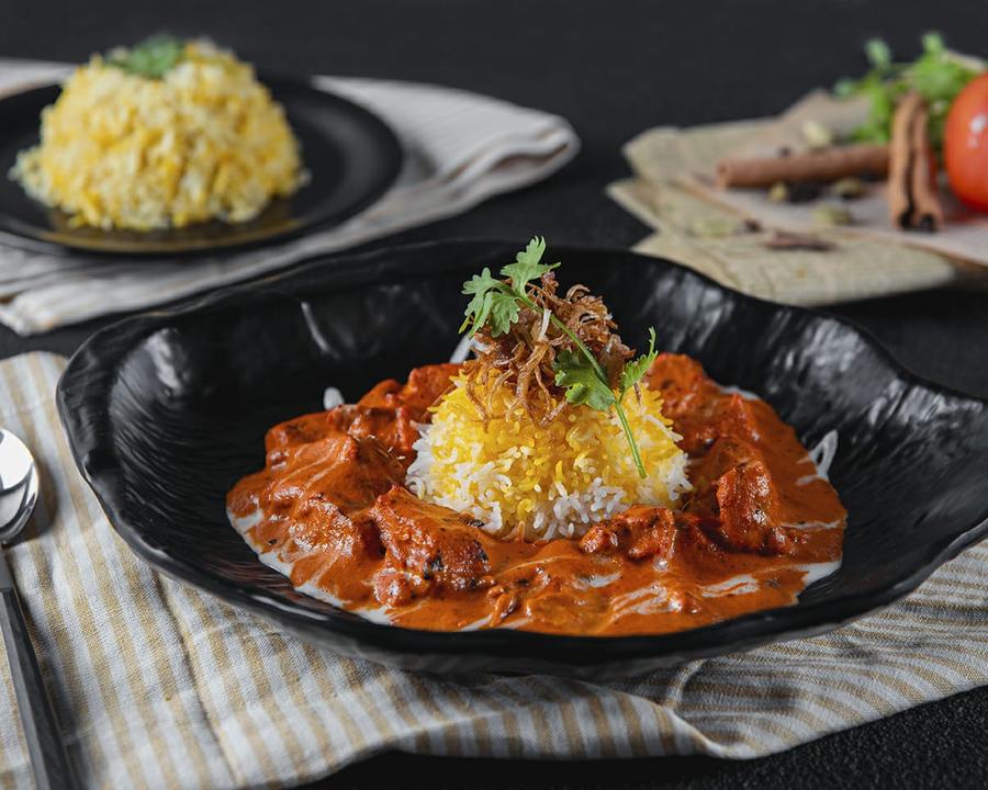 دجاج بالزبدة التقليدي يقدم مع أرز برياني مغطى بالبصل المقلي وشرائح الكريمة.