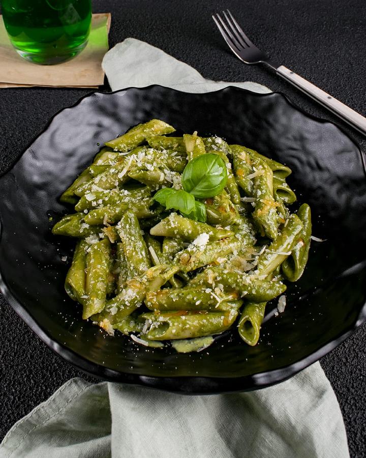 معكرونة تقدم مع صلصة البيستو ، مع اضافة جبنة البارميزان وزيت الريحان وأوراق الريحان الطازجة (أضيفي الدجاج -1000 أو أضيفي الجمبري 1.500)