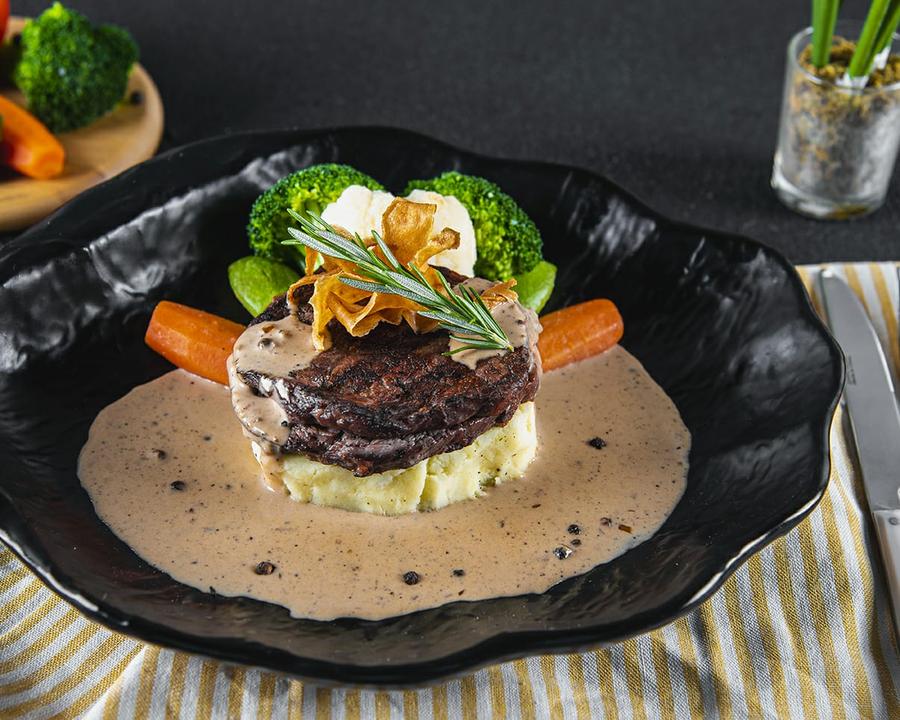 grilled fillet of beef,served with broccoli,carrot,mashed potatoes and peppercorn sauce