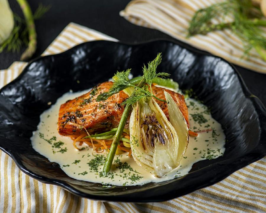 Oven baked salmon covered with herbs crust served with Julian vegetable,asparagus and fennel and citrus sauce