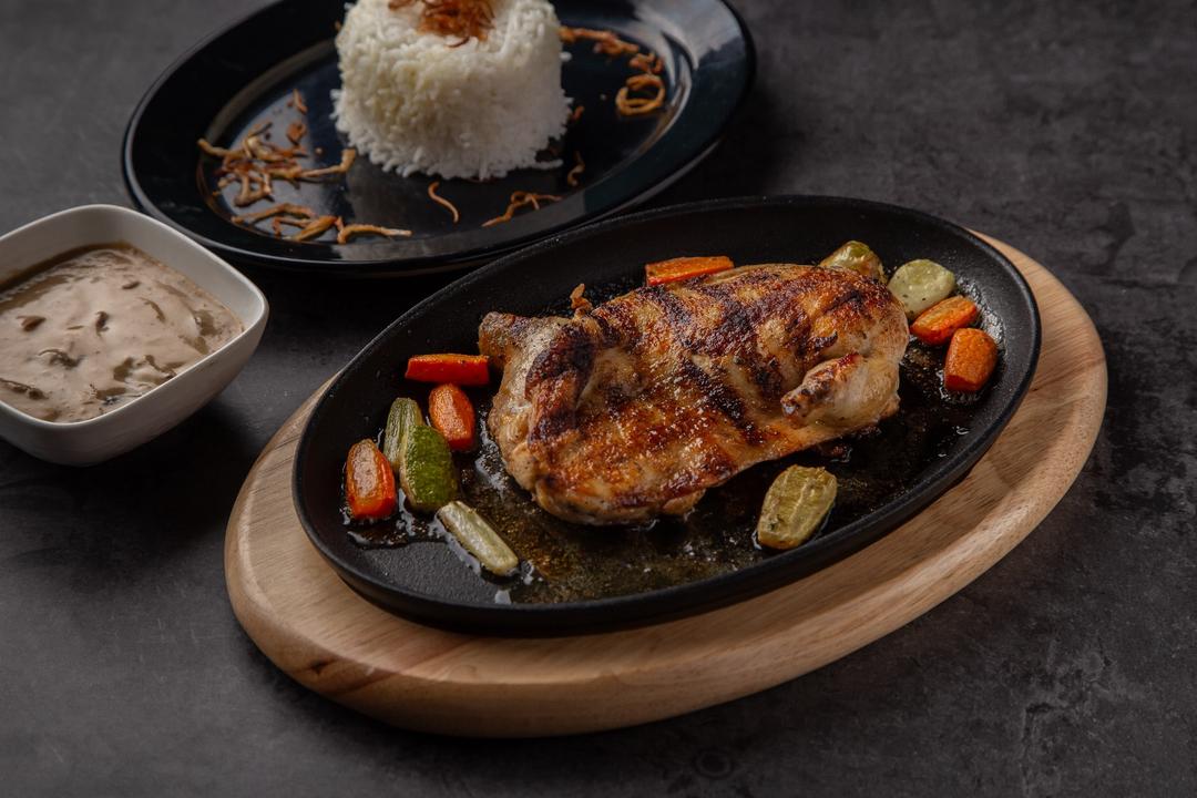 Boneless grilled Half Baby Chicken served in Sizzer Pan with vegetables and choice of Rice or French fries