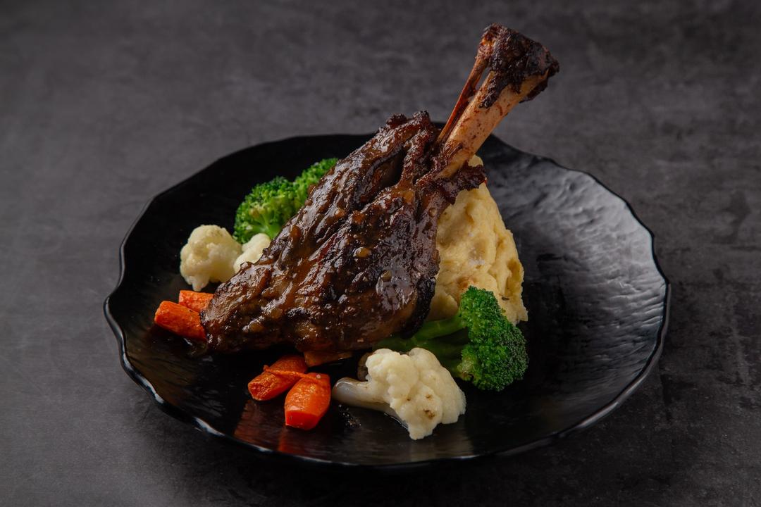 marinated lamb shank,overnight cooked served with cola glaze,yogurt mint,mashed potato,boiled vegetable zucchini or carrot served with on the top thyme and celery