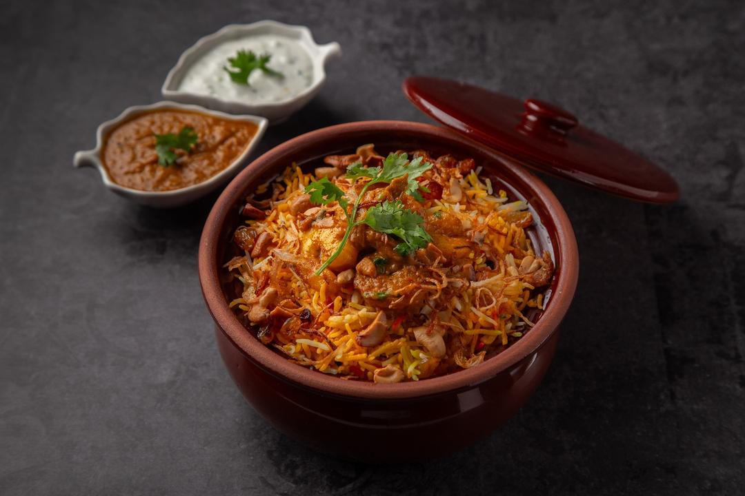 أرز بسمتي مطهو مع التوابل الهندية التقليدية والدجاج المسحب يقدم مع صلصة الكاري وزبادي الخيار.