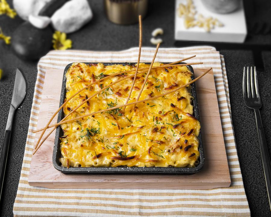 Macaroni pasta mixed with beshamel sauce , topped with yellow cheddar cheese and mozarella cheese baked in oven topped with panko bread crumbs