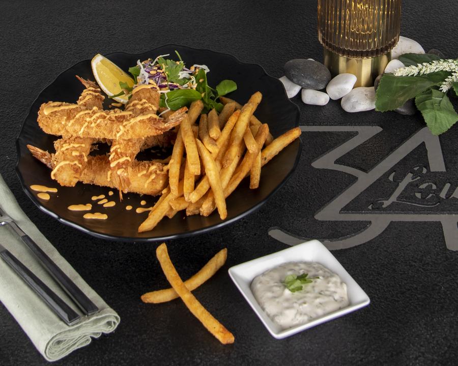 Breadded golden shrimps served with crispy French fries and Remolet sauce on the side.