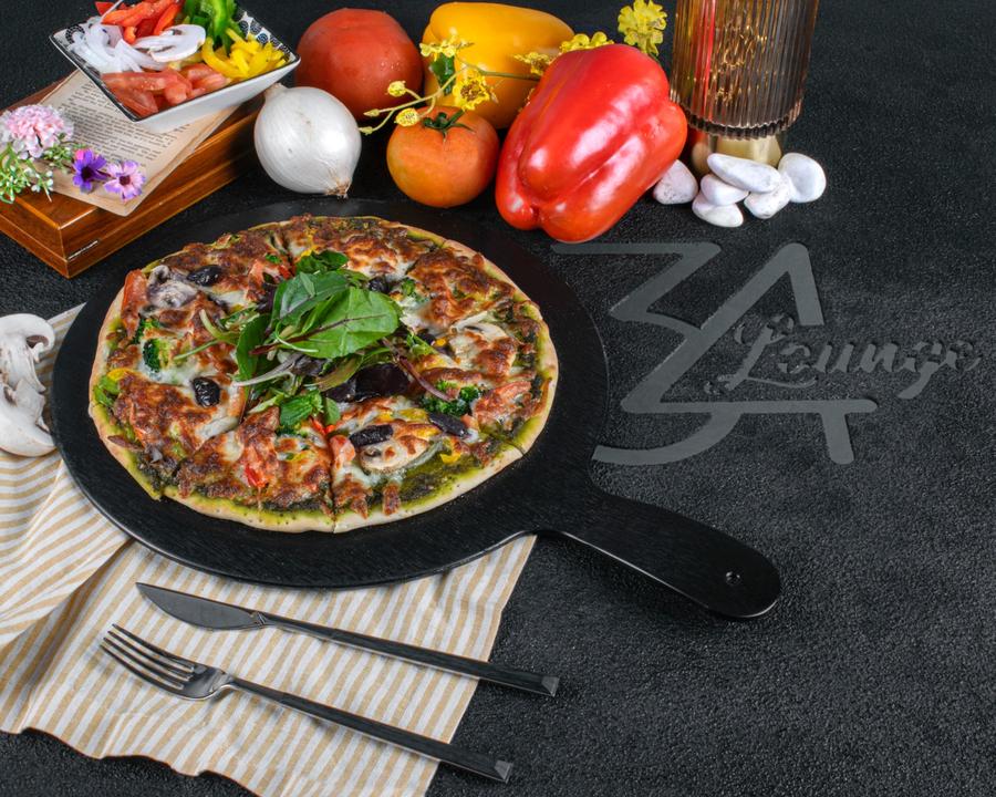 ROMAN LETTUCE, TOMATO, GREEN CAPSICUM, YELLOW CAPSICUM, RED CAPSICUM, CUCUMBER, RED ONION, KALAMATA OLIVES, FETA CHEESE TORCHED WITH VENEGRATE DRESSING SAUCE TOPPED WITH MAGIC VEGETABLES AND SPRINKLED OREGANO.