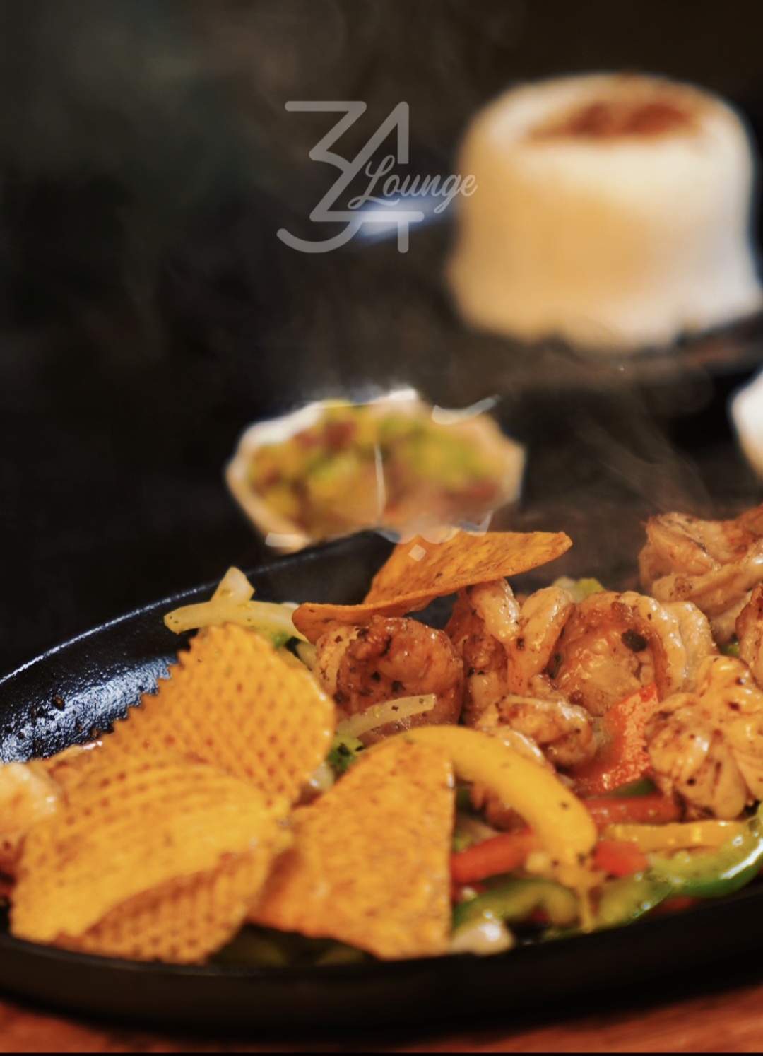 Marinated and sliced chicken sautéed in pan with white onion and mixed capcicum served on sizzler plate with white rice or French fries, sour cream and avocado Salsa.
