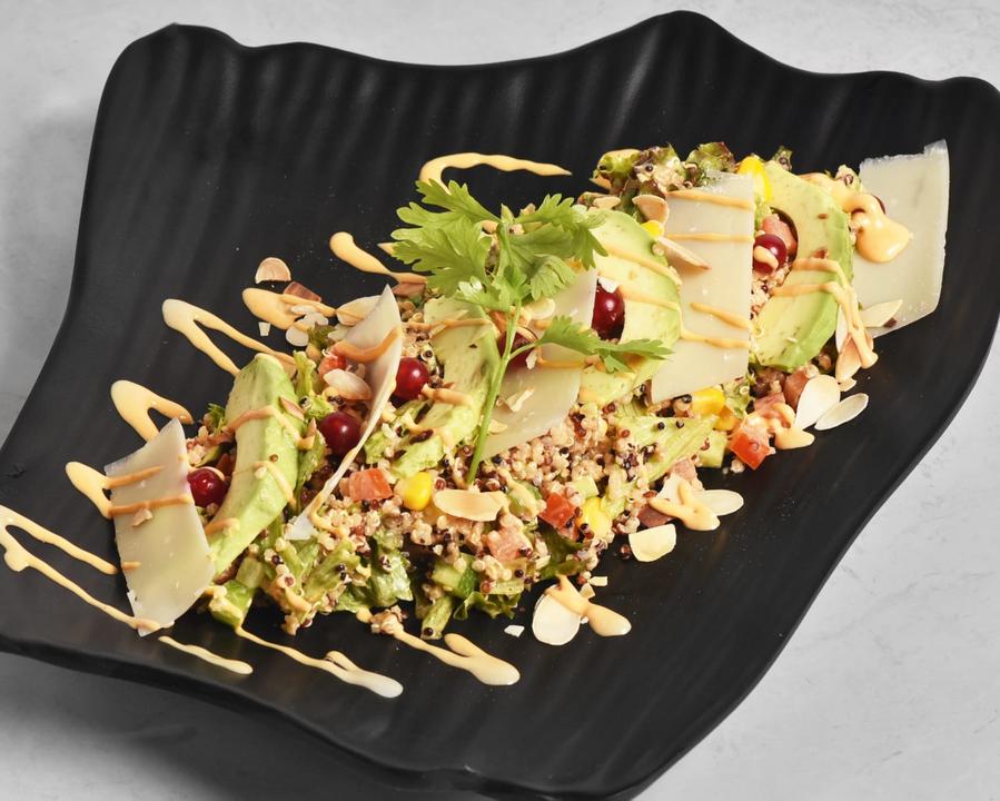 Malti Quinoa, Lulu Russo, Cucumber, mixed bell pepper, tomato, sweet corn, toassed with pink sauce topped with avacado and parmesan slice sprinkled with almond slices.