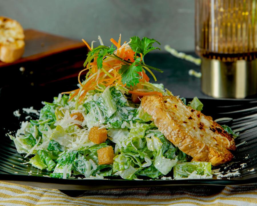 SHREDDED ROMAN LETTUCE, BREAD CROUTON, PARMESAN CHEESE TORCHED WITH SPECIAL CAESAR DRESSING SERVED WITH HERBS, MELFA, CRISPY BREAD TOPPED WITH MAGIC VEGETABLES. (Add Chicken- 1.000 Add Shrimps-1.500)