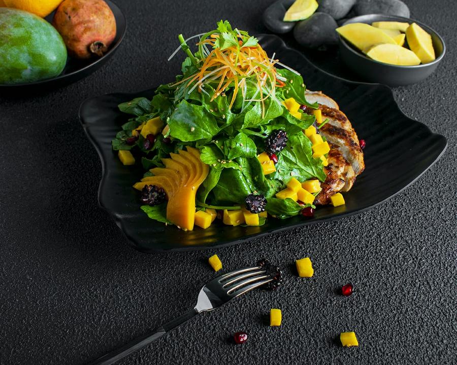 جرجير ، صدر دجاج مشوي ، قطع مانجو طازجة ، بذور رمان ، بذور سمسم ، خضروات ماجيك مع تتبيلة.