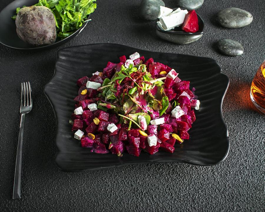 مكعبات شمندر ، محروقة بصلصة الرمان الخاصة ، تقدم مع خليط أخضر ، جبنة الماعز والشمندر المقرمش