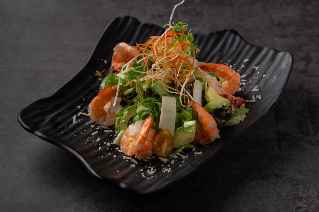 Boiled Shrimps, celery, roman lettuce, celery, avacado, cucumber tossed with mustard honey sauce, topped with magic vegetables served with cocktail sauce.