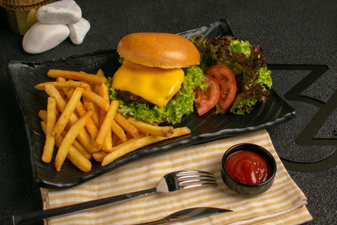 beef pate,lettuce,onion,cheese,beef beacon and eggs served with French fries