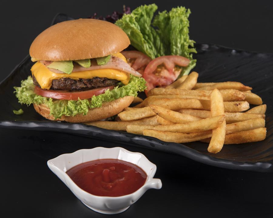 Beef pate, lettuce, avocado, turkey ham, cheese and caramelized onion served with French fries