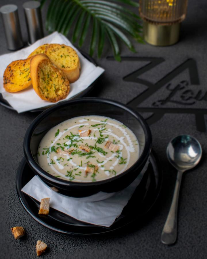 butternut squash,white onion,garlic and olive oil topped with cream and crispy parsnip