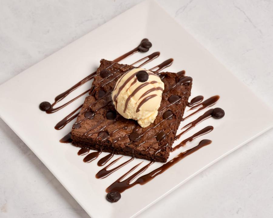 براوني خاص بيتي تقدم مع ايس كريم مغطاة بصوص الشوكلت.