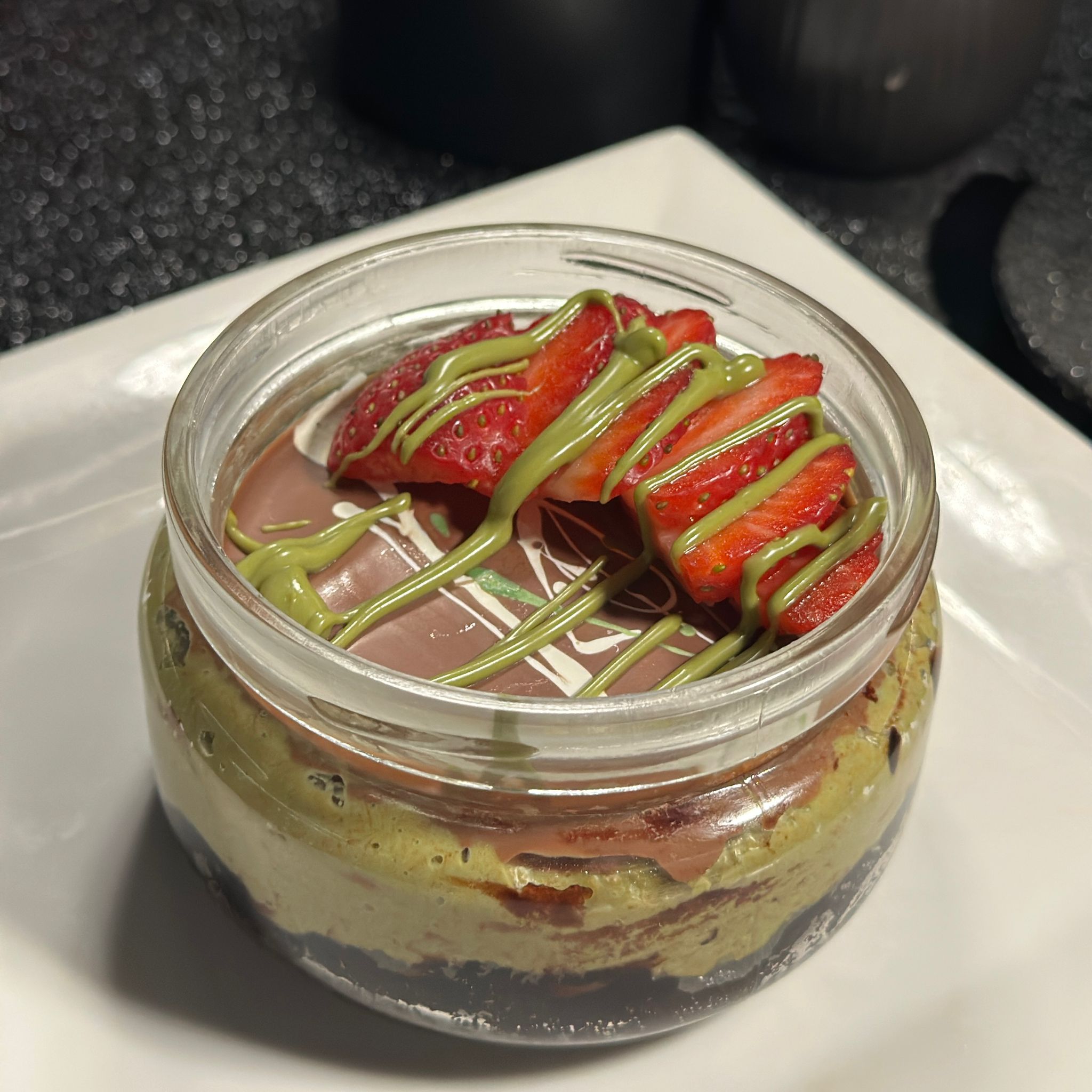 A layer Cocoa Cake covered with Kunafa, Tahini, Pistachio sauce and Chocolate sauce topped with Strawberries.