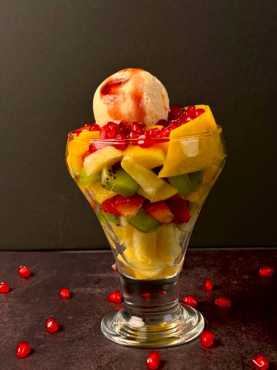 Combination of orange, mango and strawberry juice and granadine syrup topped with small cut fruits and ice cream.