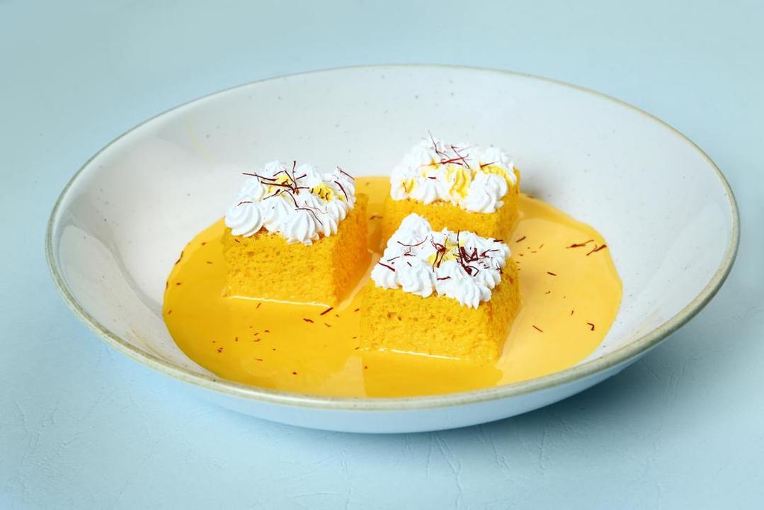 SAFFRON CAKE WITH CREAM AND SAFFRON SAUCE.