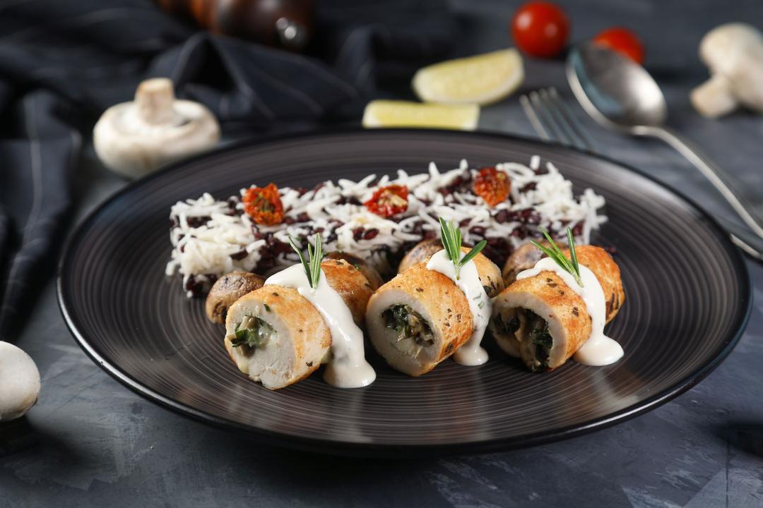 دجاج رول محشي بالفطر والسبانخ والجبنة ويقدم مع الأرز و الفطر المشوي و الطماطم المجففة