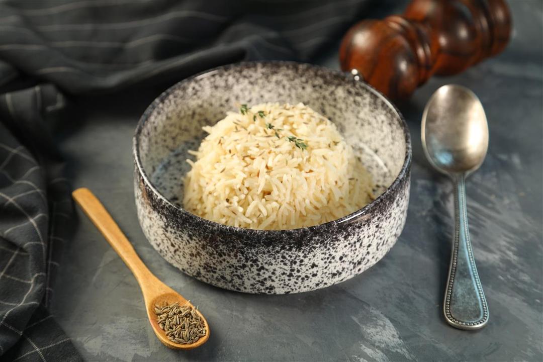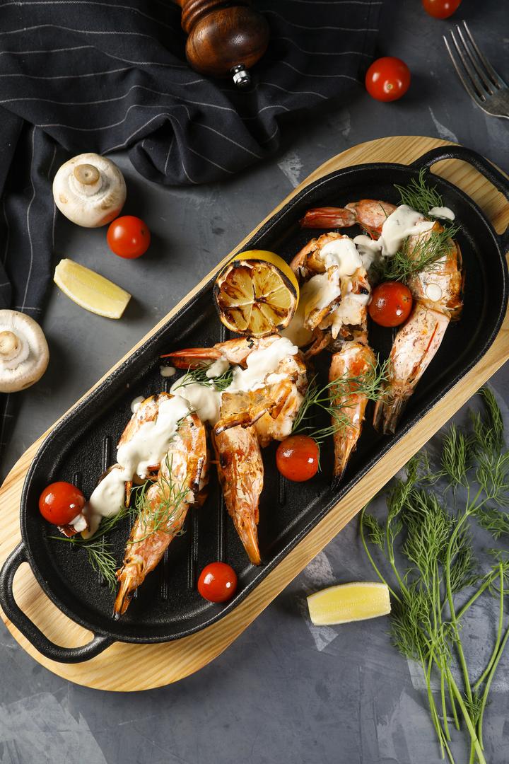 روبيان جامبو مشوي مع صلصة بتر ليمون و اوراق الشبت الطازجة و يقدم مع أرز الكمون