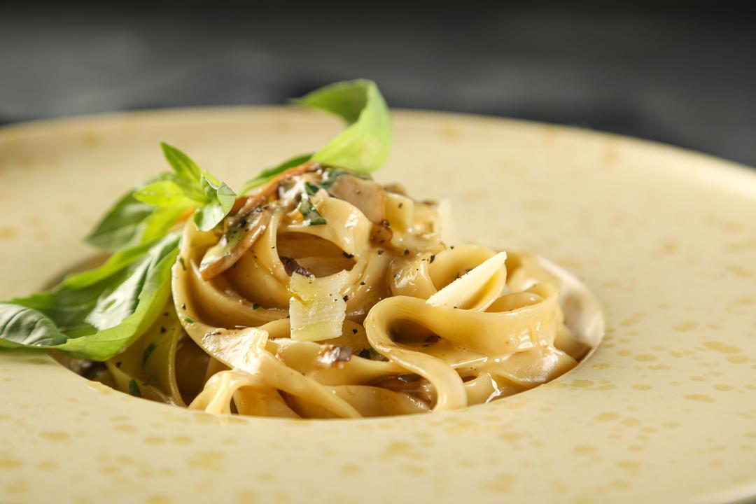 Tagliatelle pasta mixed with creamy sauce, wild mushroom, parmesan cheese and fresh basil leaves