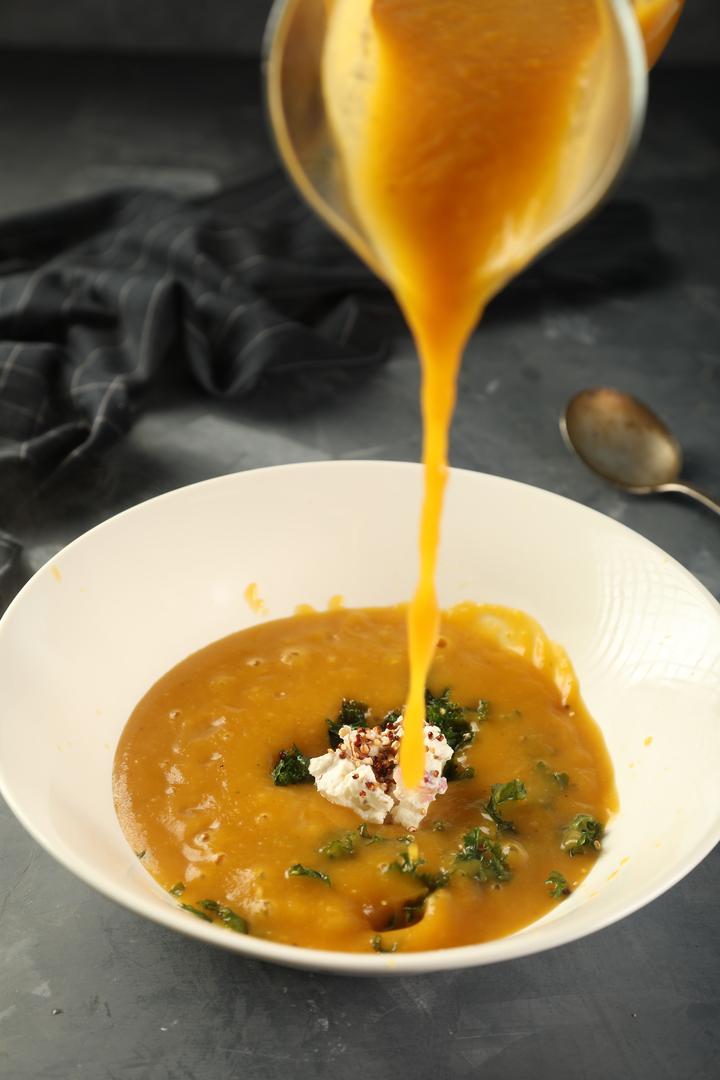 ROASTED PUMPKIN SOUP WITH FETA AND CRISPY KALE