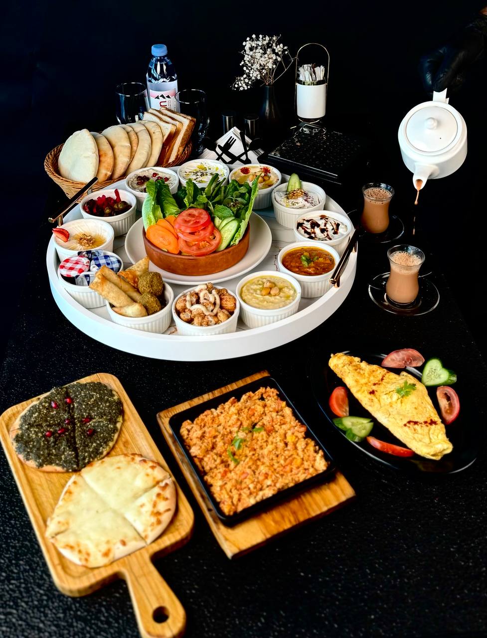 حمص، فتة باذنجان، متبل، فتوش، لبنة، فلافل، فول، جبن أبيض، بيض من اختيارك، زيتون ومخللات، تقدم مع خبز لبناني طازج، لفائف خبز، شاي وماء.