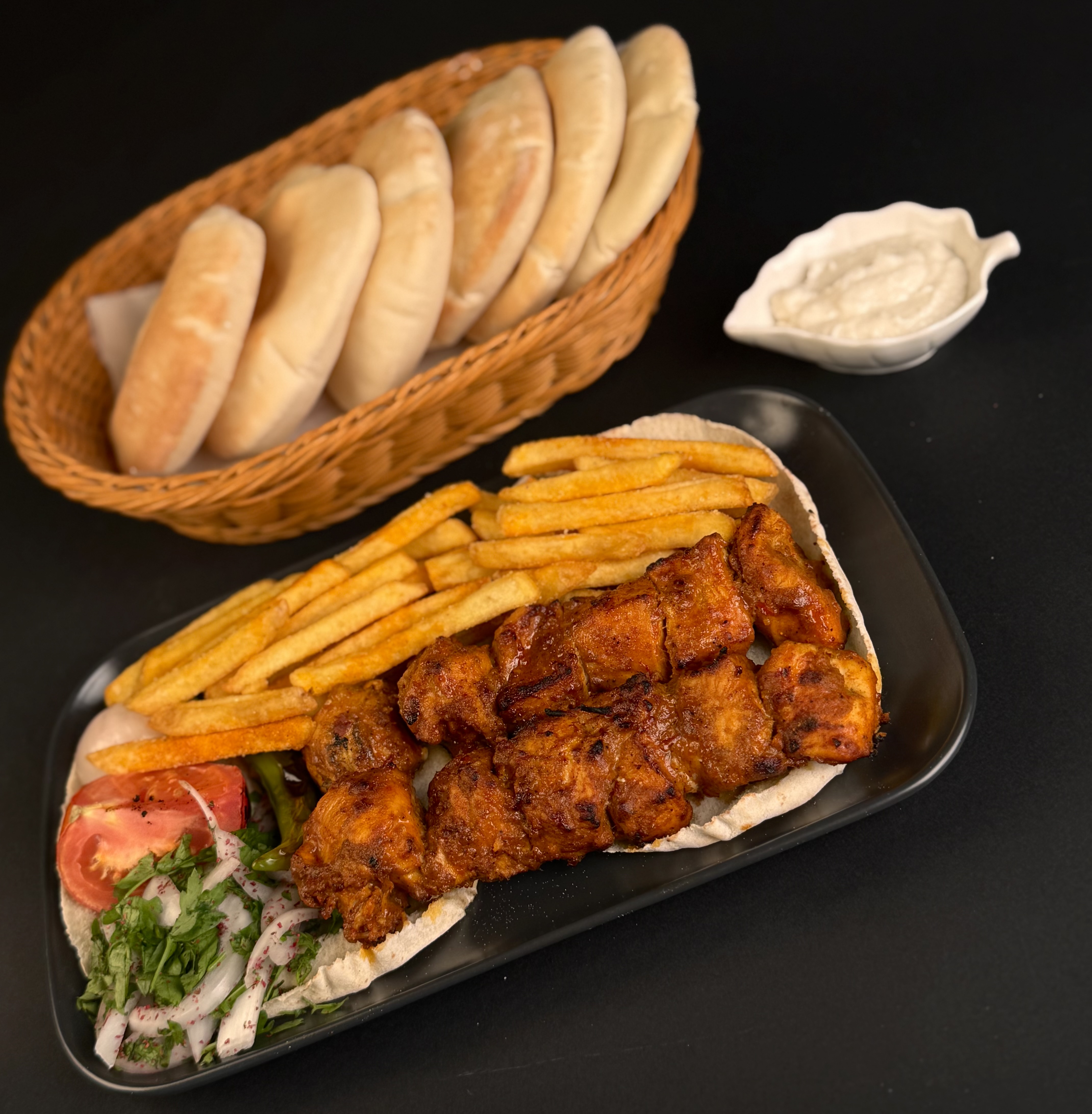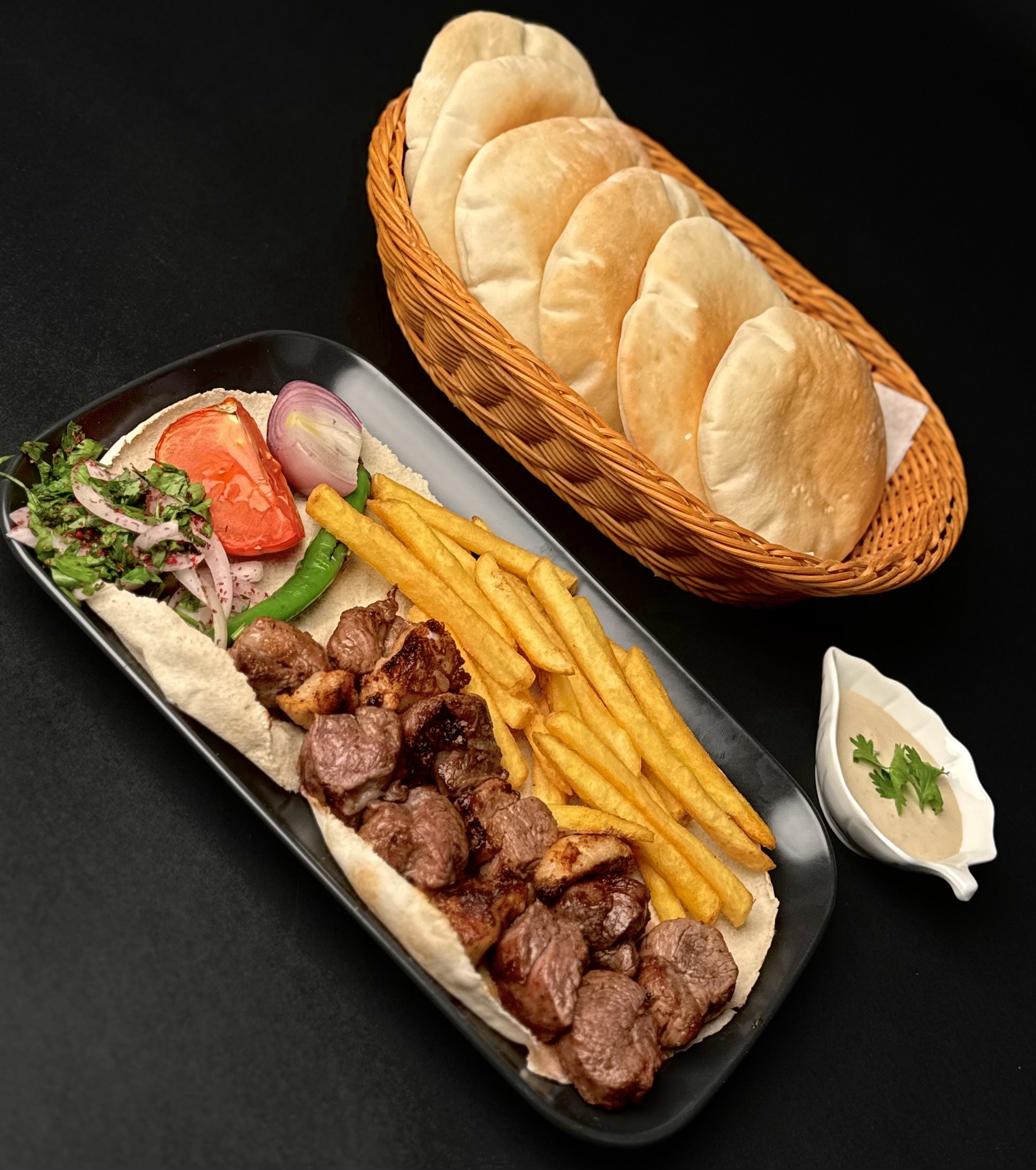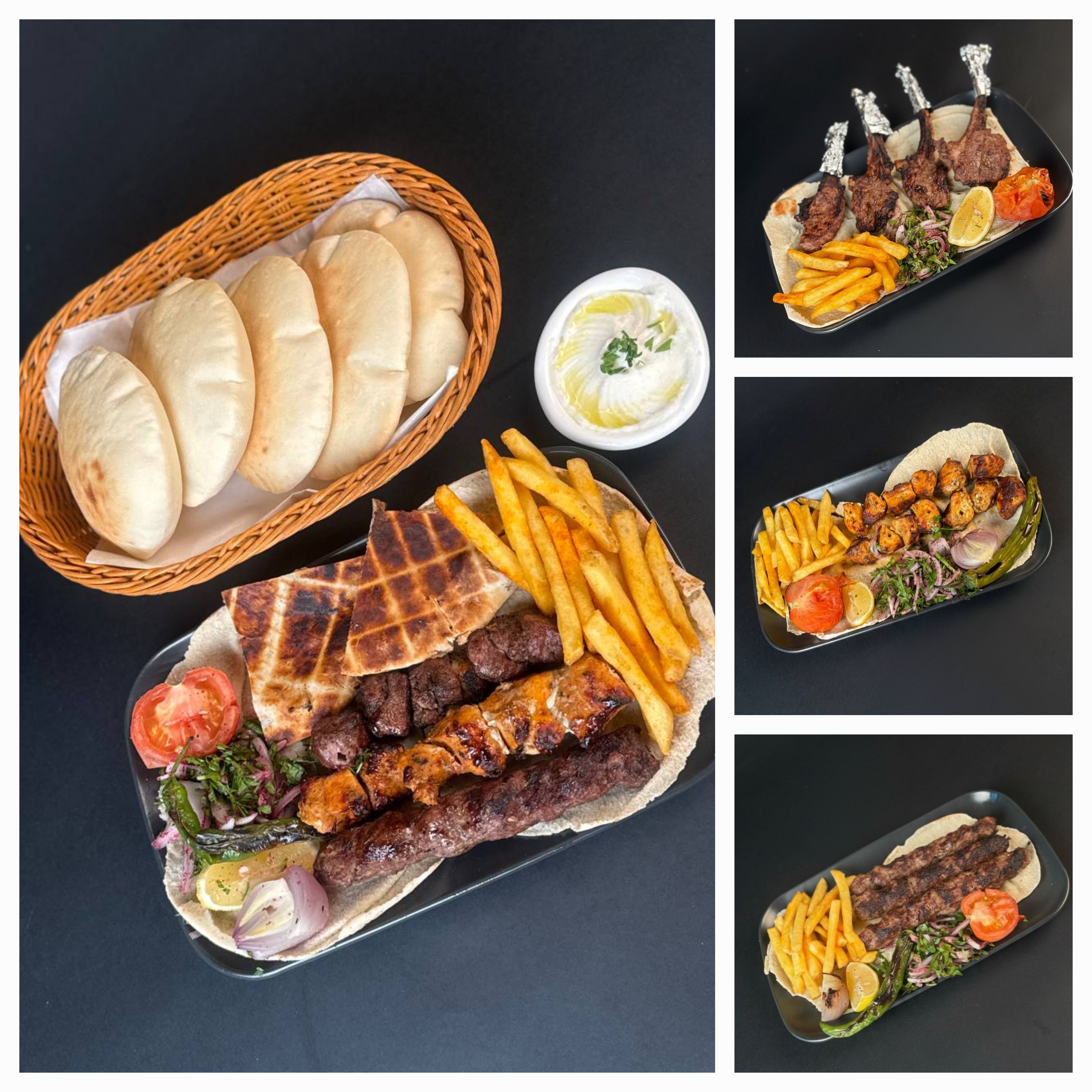 1 Kebab - 1 Tikka - 1 Chicken - 2 Arayes Bread Served with French fries - Garlic Sauce