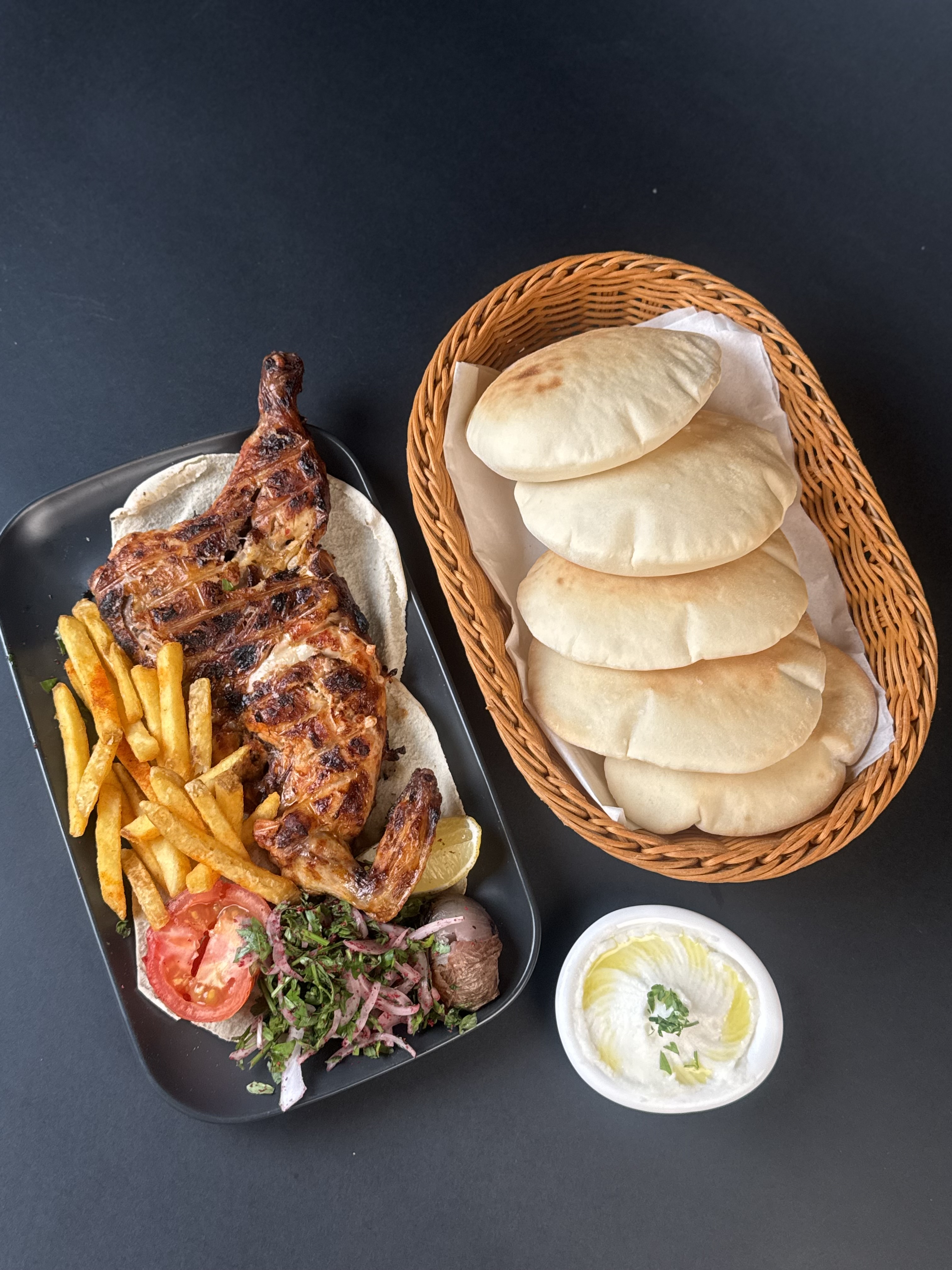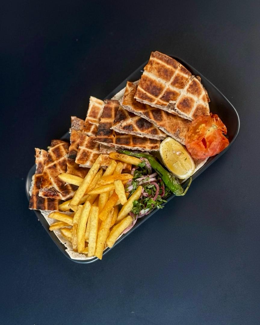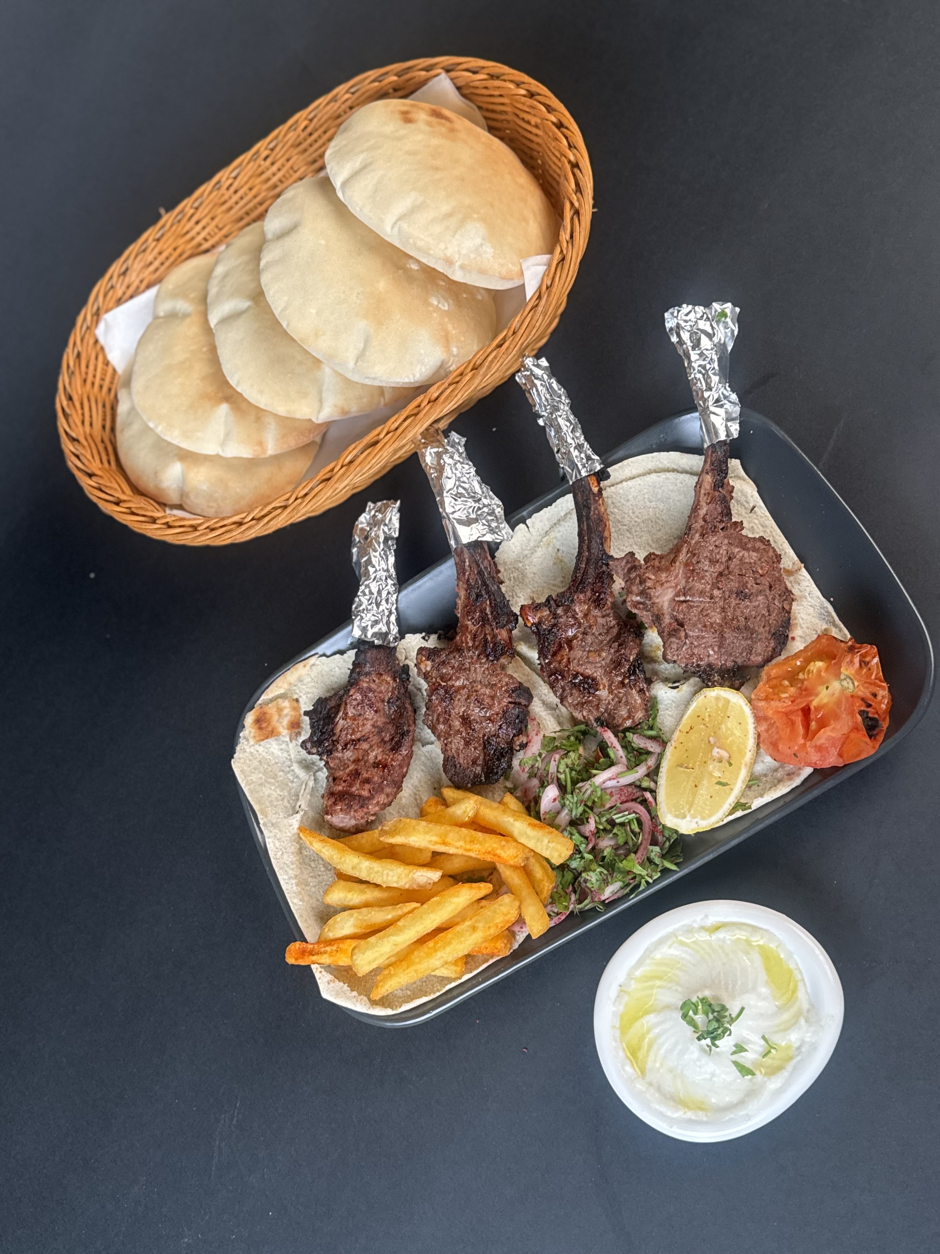 1 Kebab - 1 Tikka - 1 Chicken - 2 Arayes Bread Served with French fries - Garlic Sauce