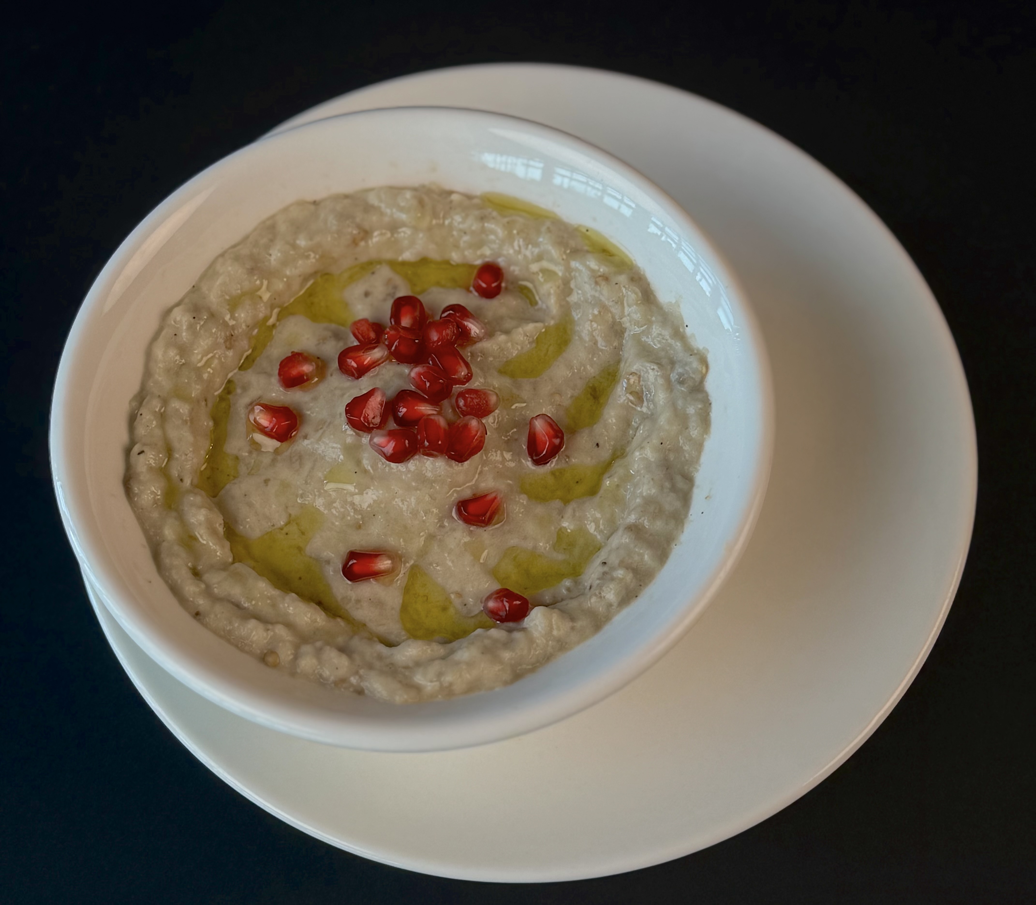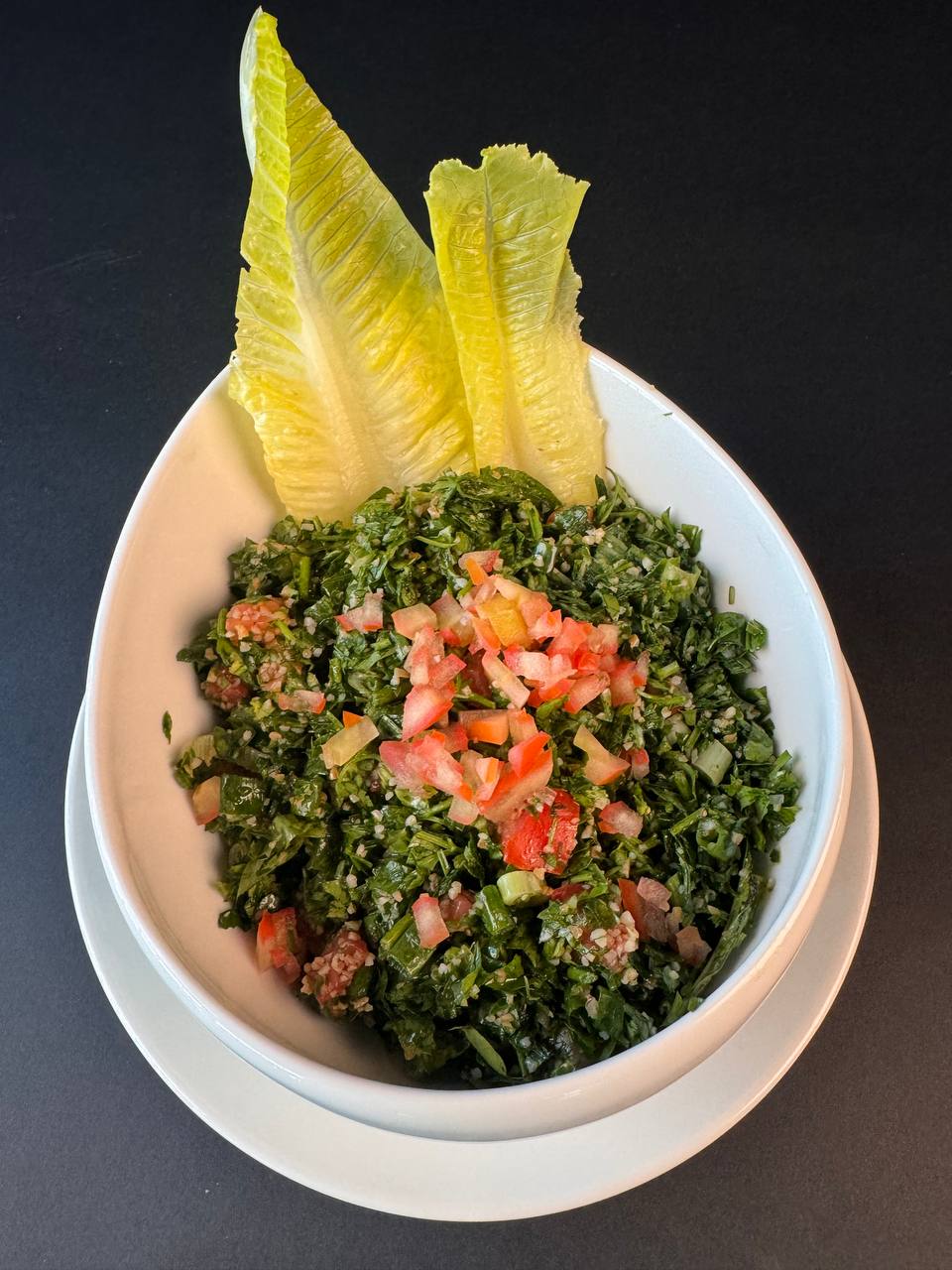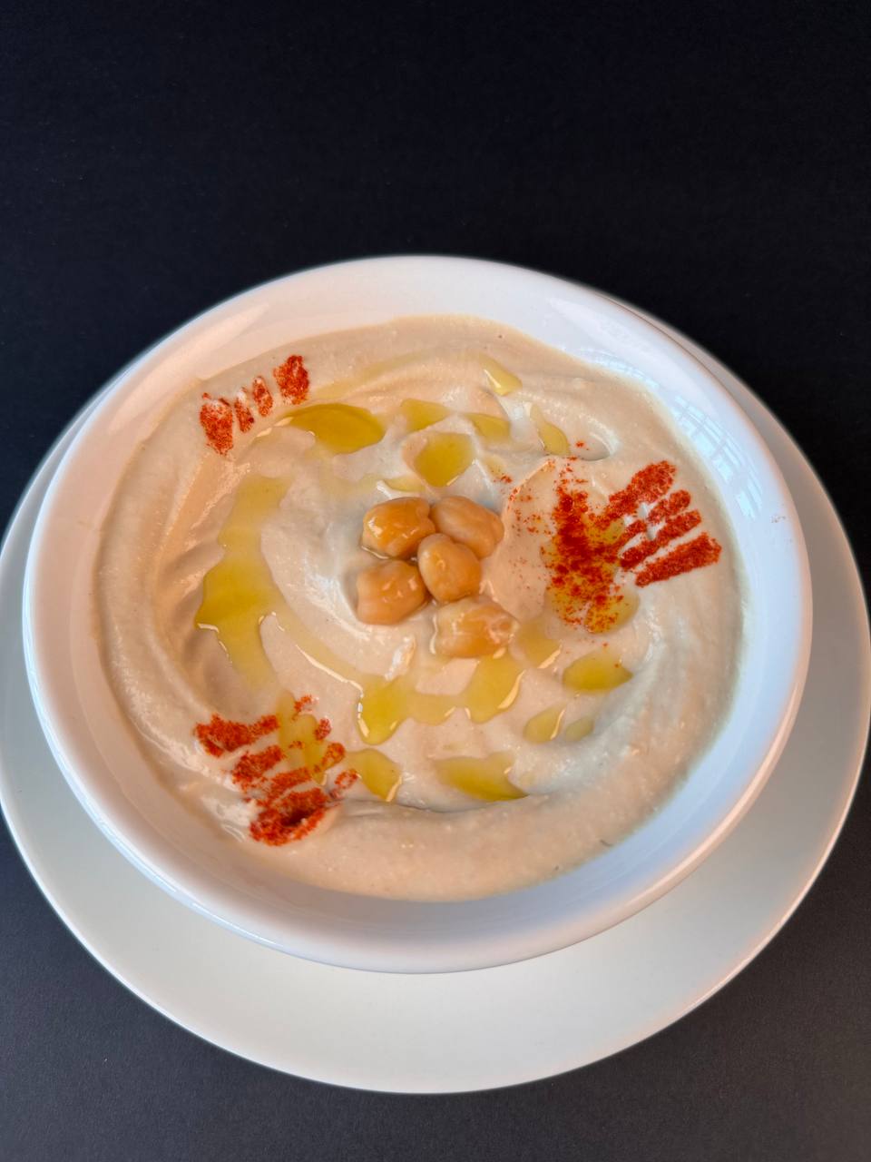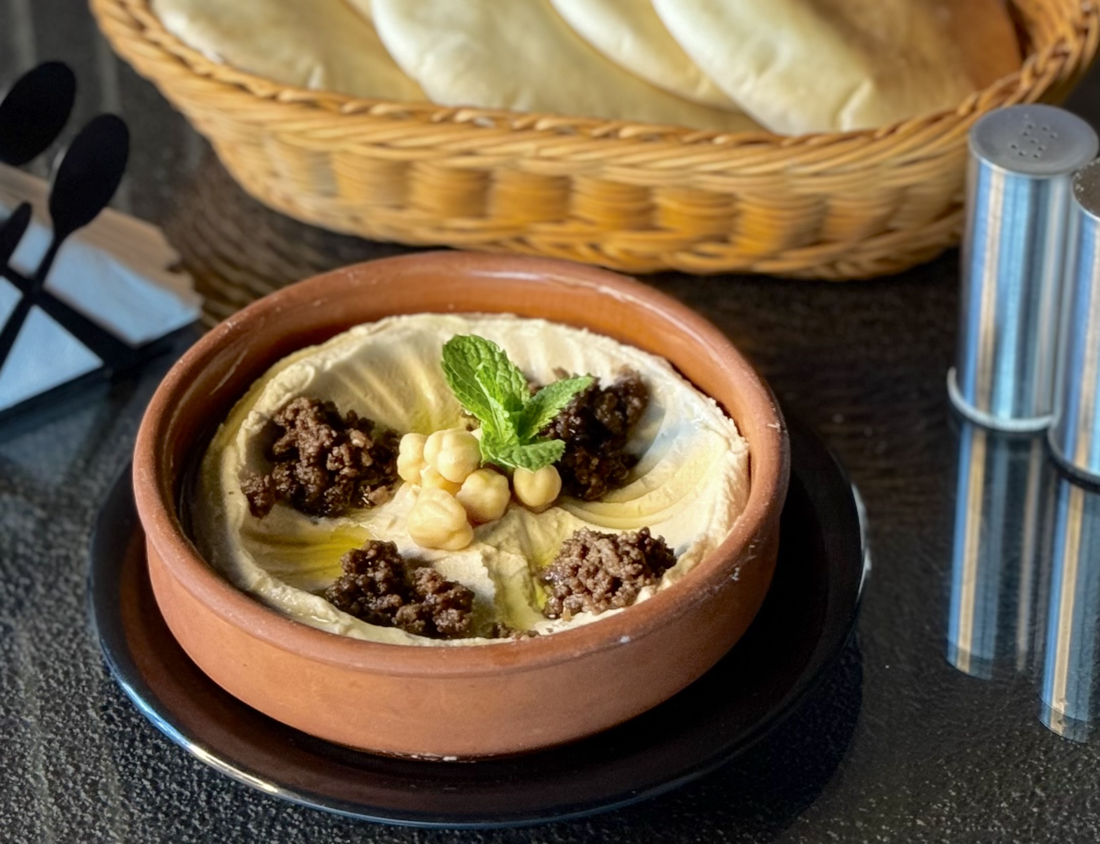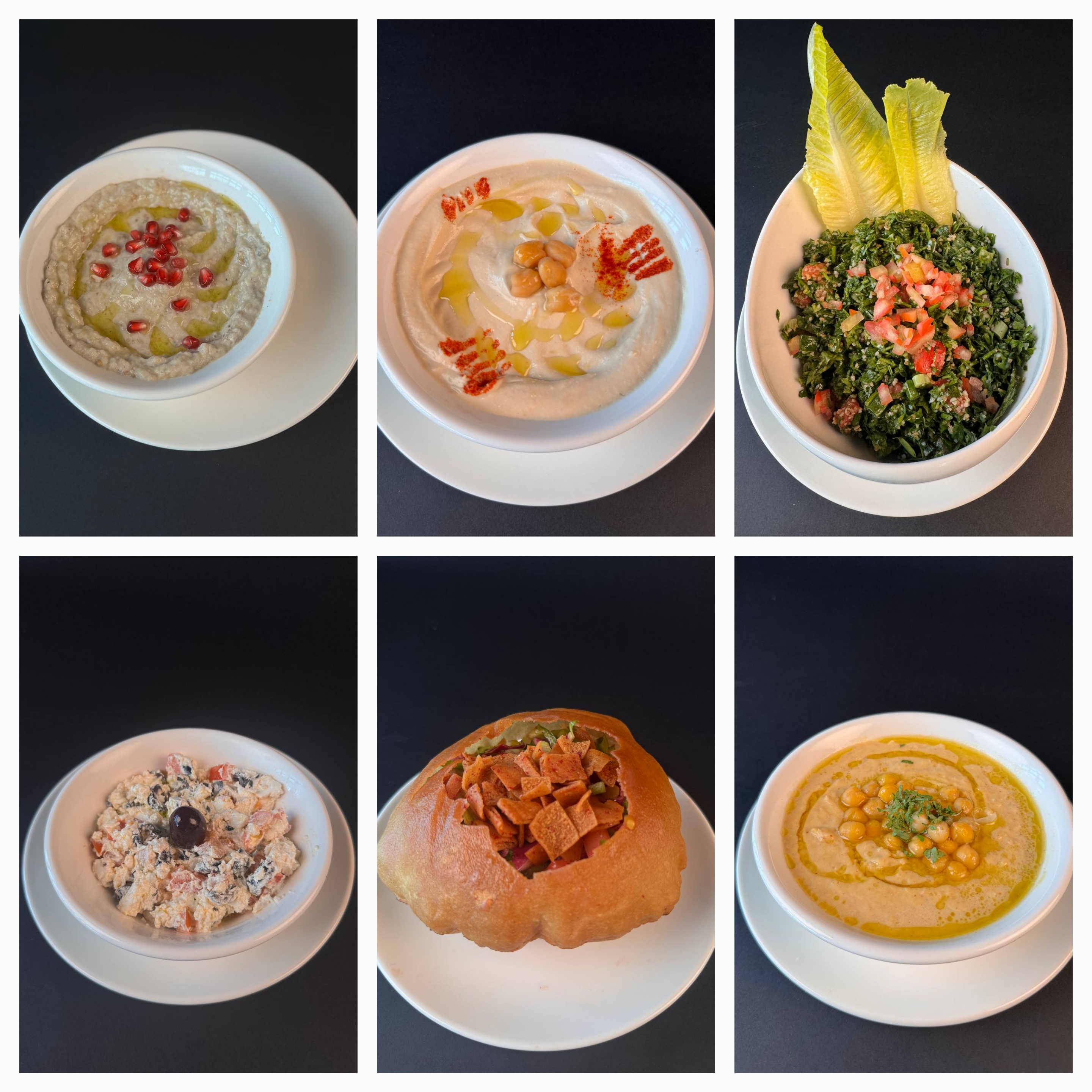 Hamous, Mutabbal, Fattush, Lebneh, Fatteh, Foul, filafil, mutabbal, white cheese, sambusek, spring rolls, pickle, olives, Lebanese Bread served with Tea