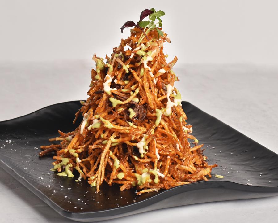 golden butter fried shrimps torched with Volvo sauce, sprinkled cilantro and chipotle sauce, cubes of avacado served Tortilla basket or crispy rice noodles basket.