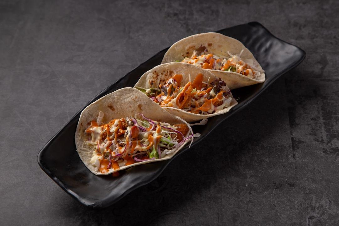 جمبري مقلي ذهبي مقرمش، جبنة مبشورة، خس مبشور، ملفوف و خيار ملفوف في خبز تورتيلا مع صوص وردي خفيف