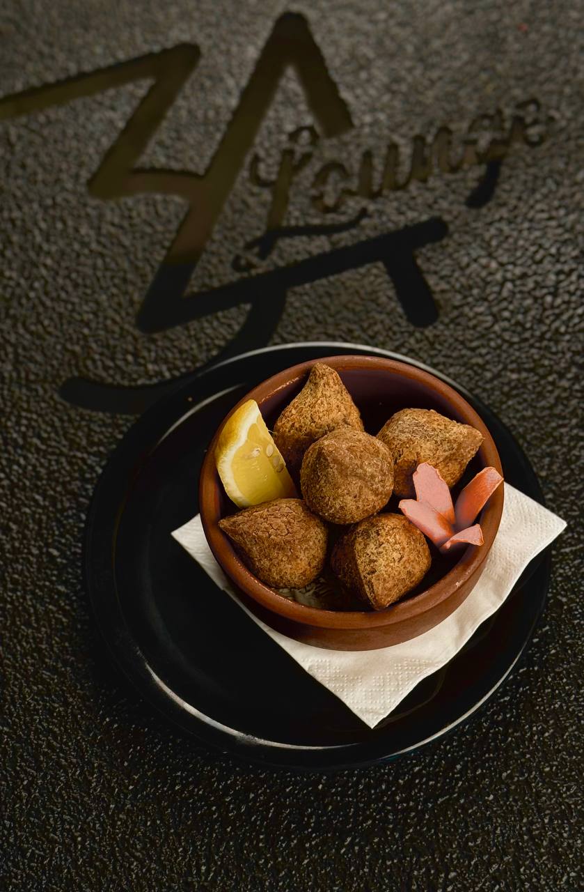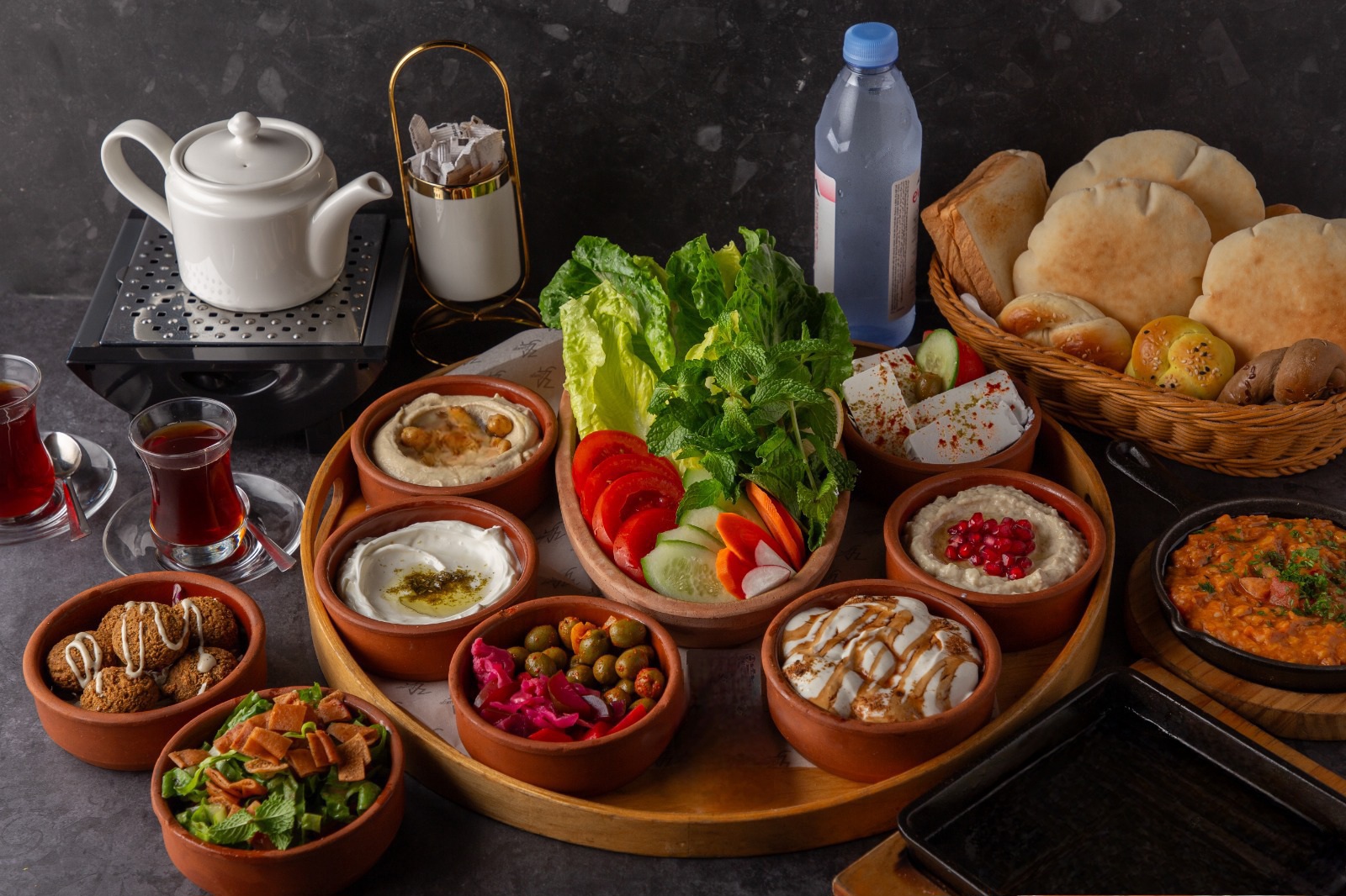 حمص، لبنة، فول، فلافل، جبنة فيتا بيضاء، سلطة خضراء، زيتون، مخلل وشاي يقدم مع الخبز اللبناني