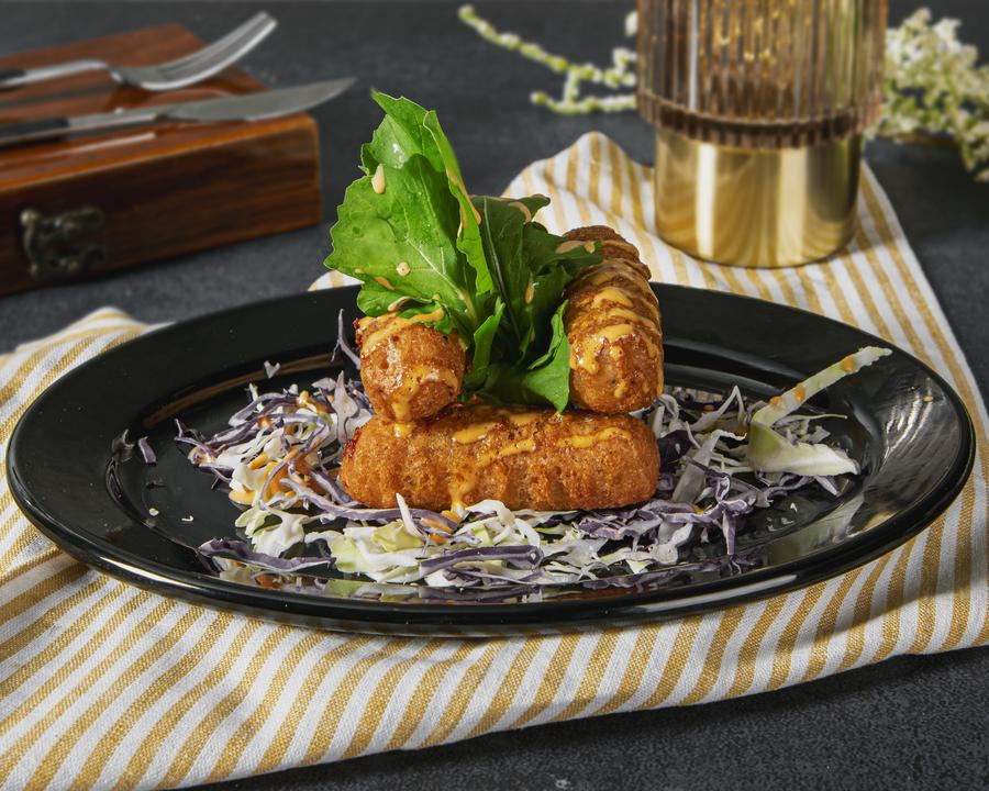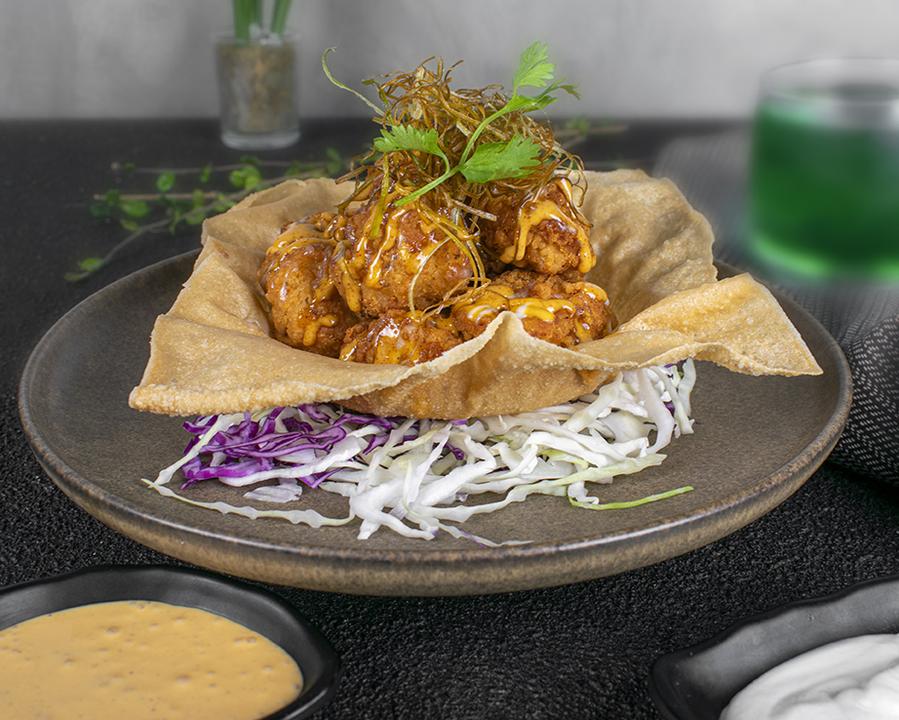 Marinated and fried Chicken leg cubes Marinated dipped with tempura batter tossed with Asian mild sauce sprinkled with chipotli sauce served on papadam basket.