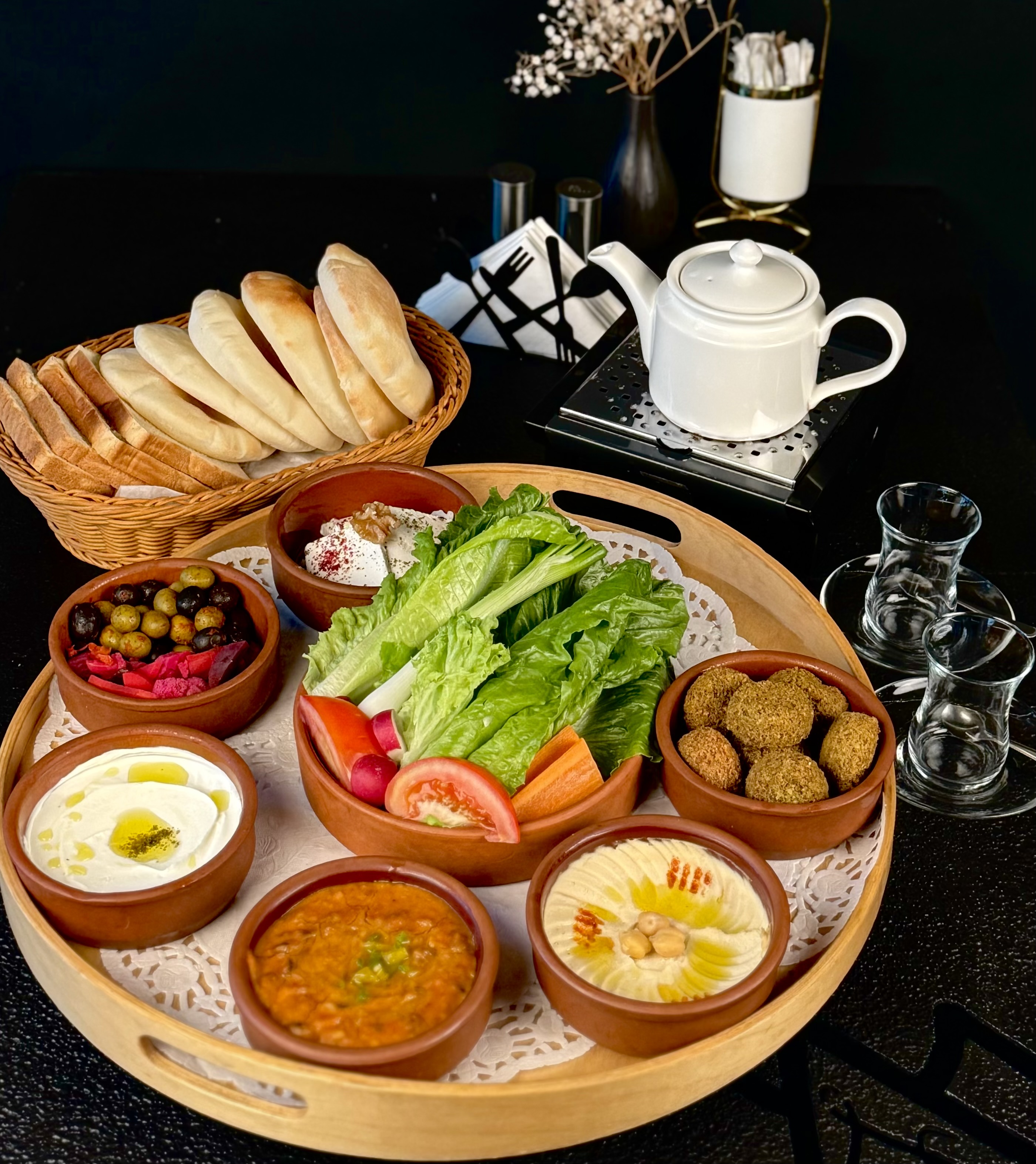 Hamous, Lebneh, Foul, Filafil, White Fetta Cheese, Green Salad, Olives Pickles and Tea served with Freshly Baked Lebanese Bread.