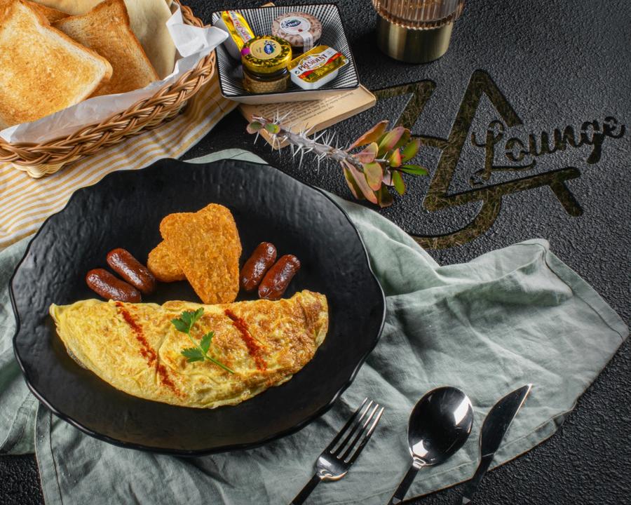 Egg Omlette stuffed with Cheese served with Beef Sausage, Has brown Potato, Jam. Butter and Honey, Homemade Bread and Toasted Bread.